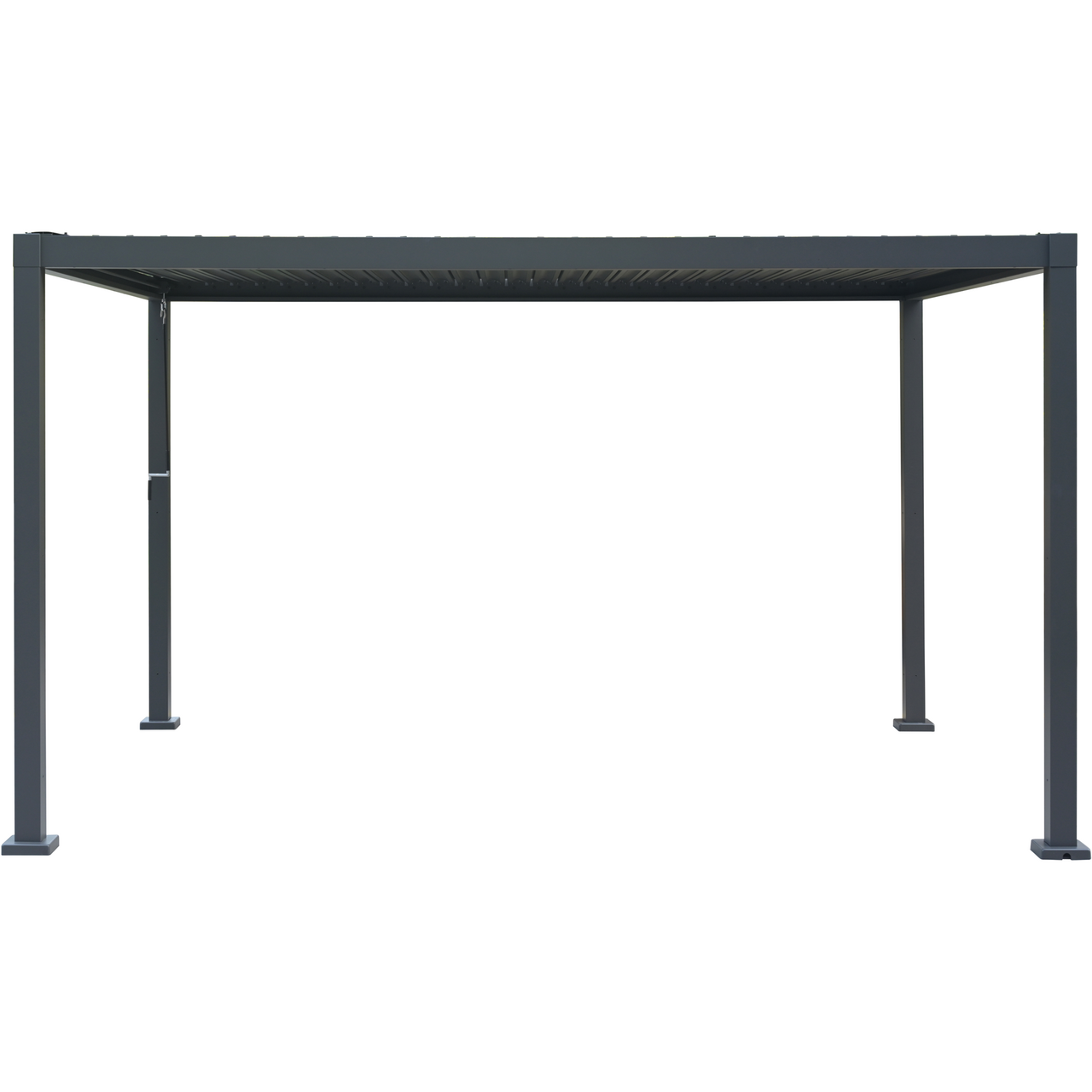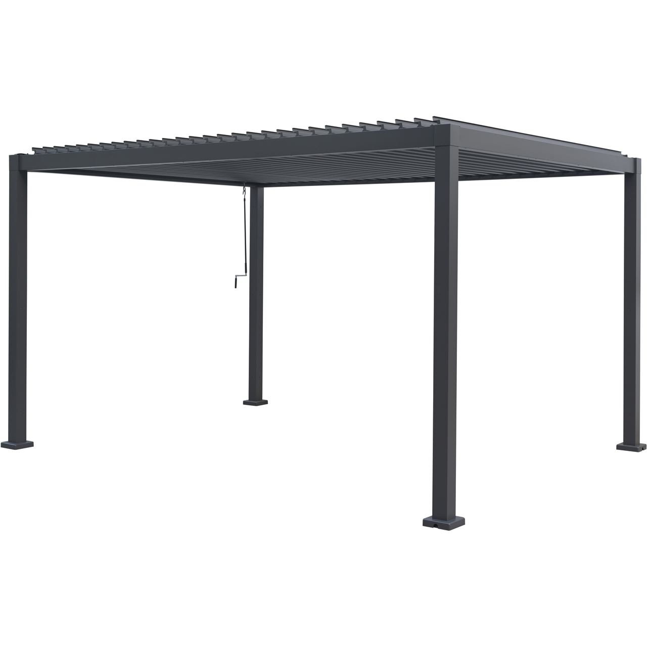 De dreibare taklamellene justeres enkelt slik at du kan regulere lysinnslipp og ventilasjon etter behov. Pergolaen kan oppgraderes med sidepanel mellom stolpene.