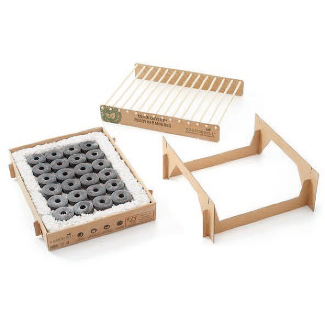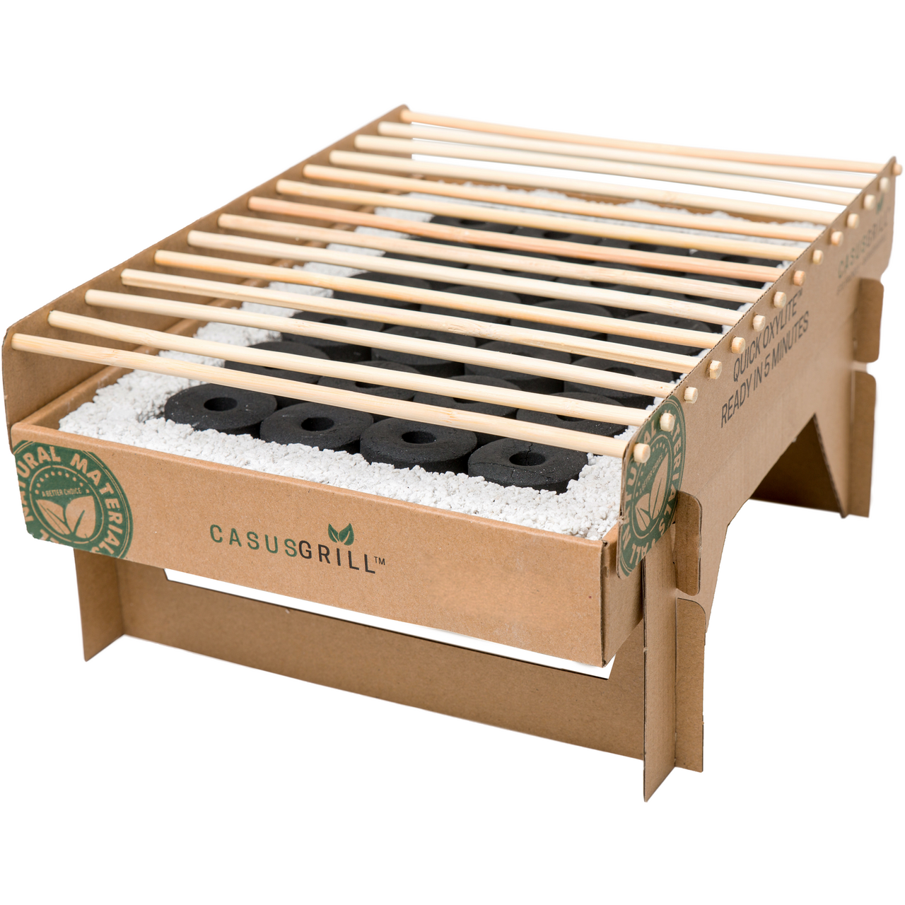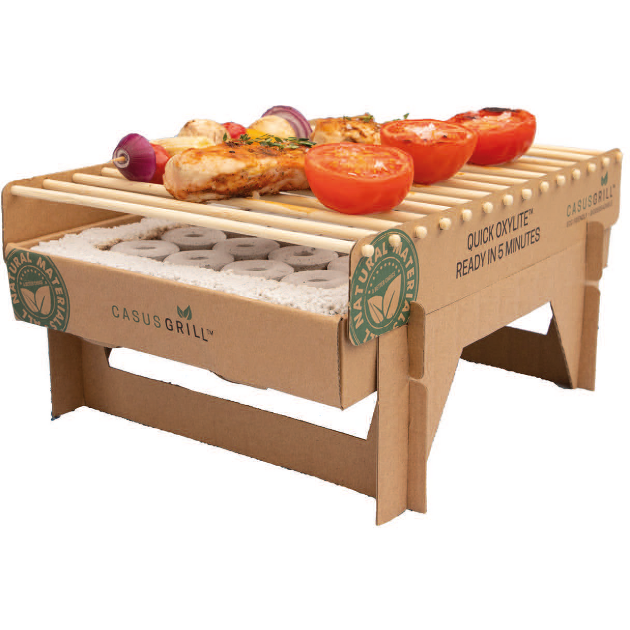 Denne engangsgrillen er en miljøvennlig løsning laget av biologisk nedbrytbare materialer, uten bruk av metaller eller fossile brensler. Quick Oxylite™ gjør det klart til matlaging på 5 minutter med en jevn temperatur på opptil 400 °C.