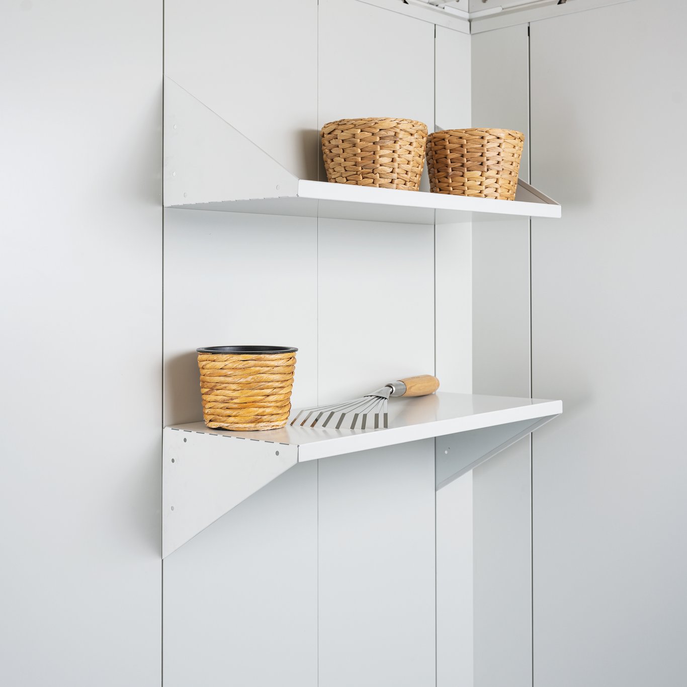 Disse hyllene fra Biohort er av varmeforsinkede stålplater, og er til Neo redskapsbod.