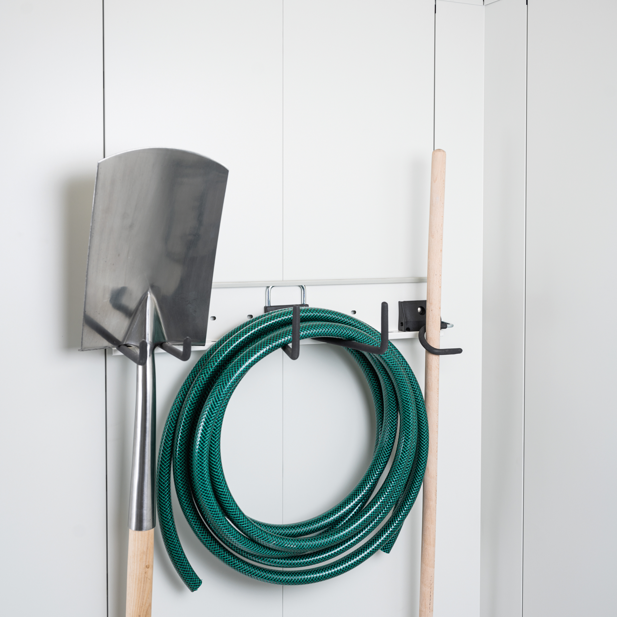 Dette kroksettet fra Biohort består av en veggskinne med en kombinasjonskrok, en håndtakskrok og en spadekrok.