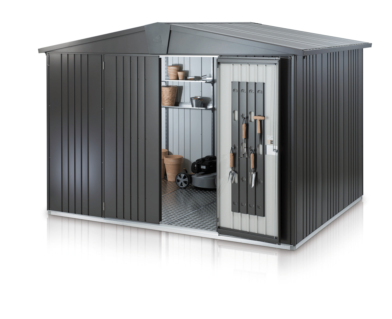 Praktisk redskapsbod for oppbevaring av f.eks verktøy og hageredskaper. Dette er den ultimate uteboden som oppfyller alle kravene for sikkerhet og funksjonalitet, ikke minst er den 100% vedlikeholdsfri. Boden er laget av varmgalvaniserte, polyamidbelagte stålplater og har skruer, bolter og hengsler av rustfritt stål. De solide materialene gjør boden motstandsdyktig mot snømengder opp til 150 kg pr m2. Redskapsboden kommer med 4 stk verktøyhenger og 2 hyller med beslag.
