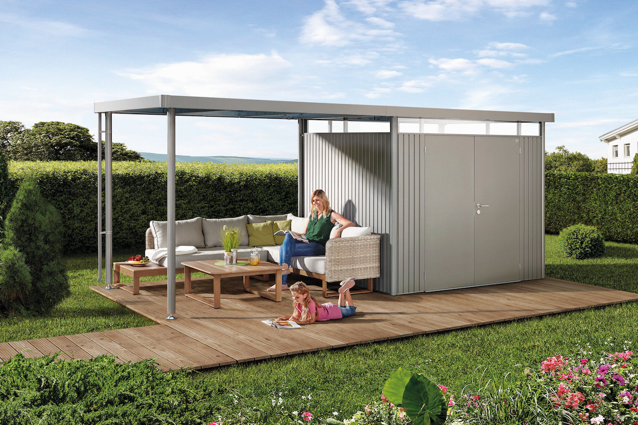 Ved siden av kan du kjøpe sidetak som festes til boden på siden med takrennen og som kan monteres på en eller begge sider av boden. Dette skaper en overbygd, åpen plass som tilsvarer grunnflaten på boden. Sidetaket til Higline H3-serien i kvartsgrå finner du her.