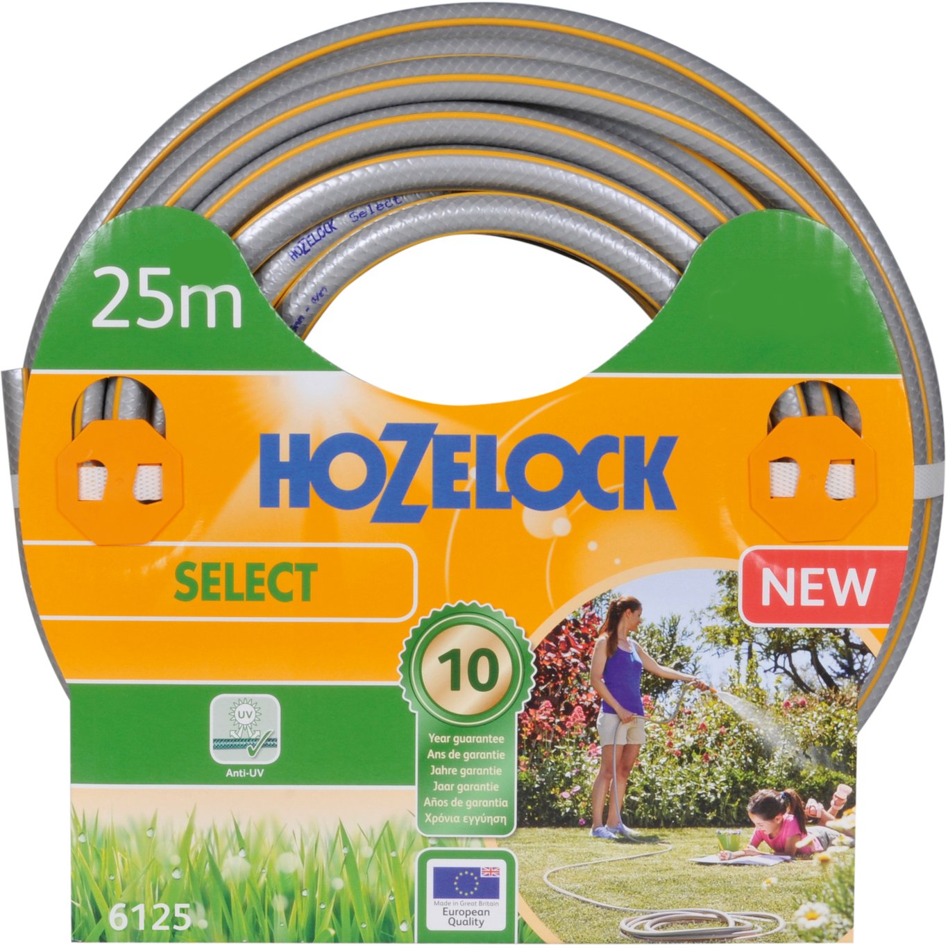 25 meter lang, 4 lags og kryssarmert hageslange med 10 års garanti.