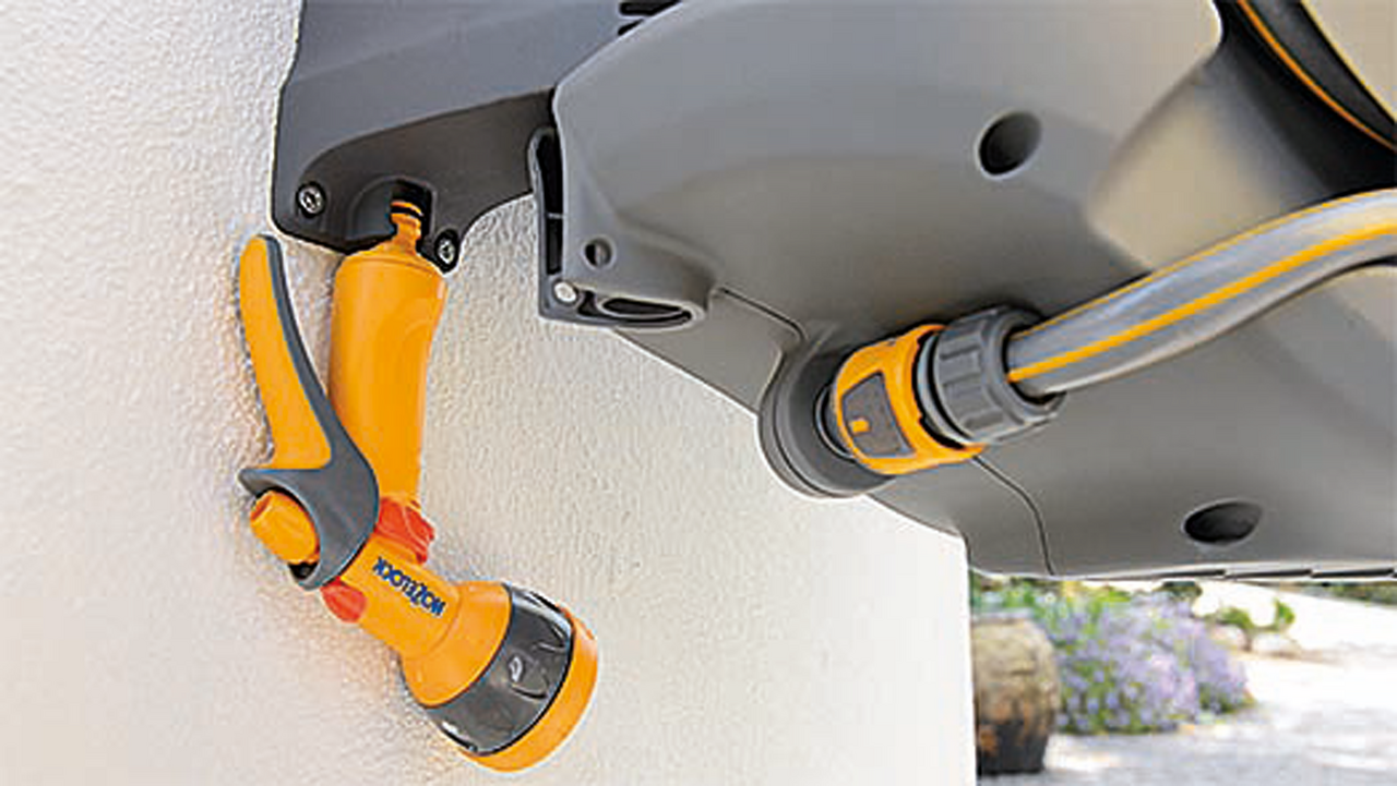 Trommelen har en bremsemekaniske, slik at den går rolig tilbake når den er ferdig i bruk. Trommelen kan svinge 180 grader, slik at du kan nå alle steder i hagen din. Trommelen har praktiske lagringspunkter, hvor du kan plassere ekstrautstyr som sprøytepistoler etc.