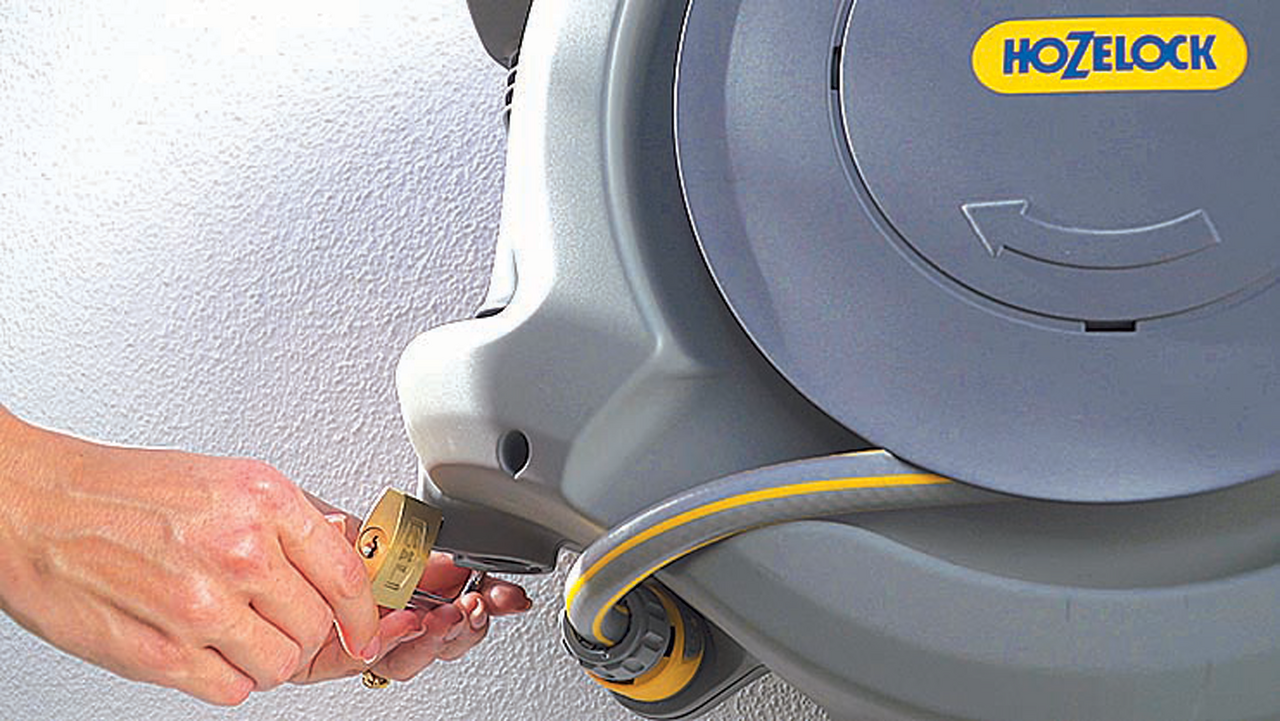 Trommelen har en integrert barnelås, slik at slangen ikke kan dras ut nedover. Slangestopperen forhindrer at slangen ikke trekkes helt inn, slik at den er tilgjengelig til enhver tid.