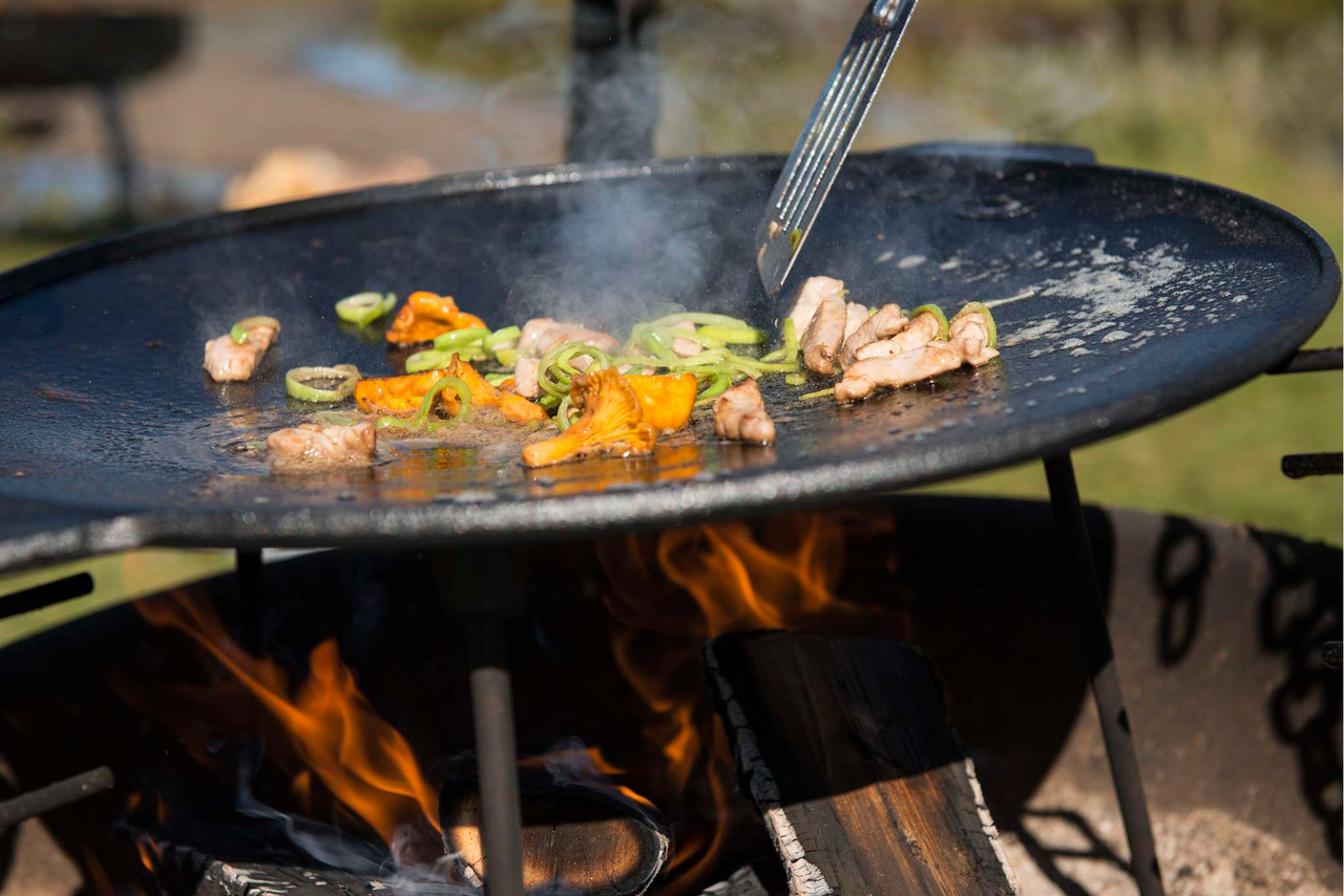 Steikehelle i støpejern med bein gir stabile forhold for matlaging over bål og holder godt på varmen.