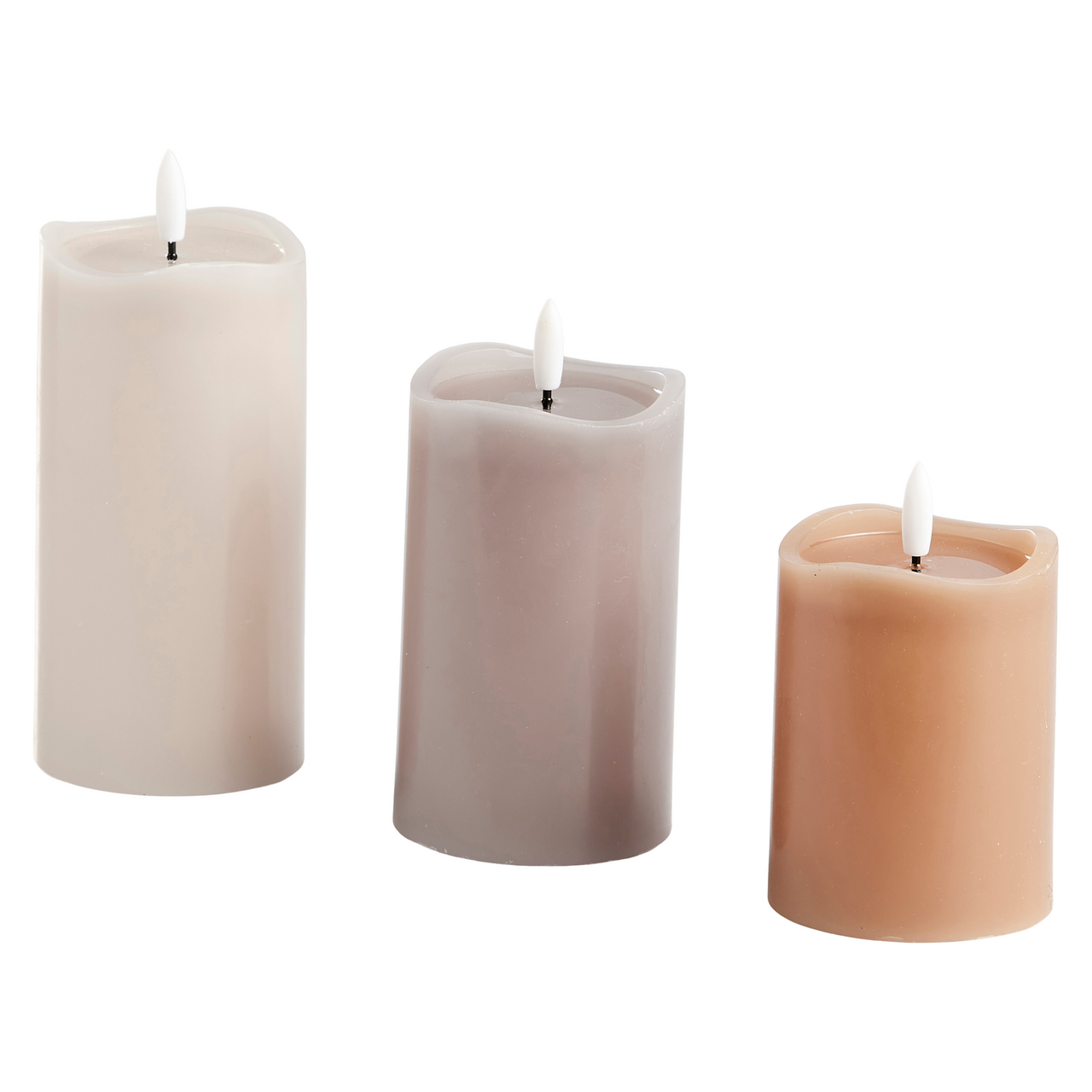 Sett med tre LED-kubbelys, som gir et varmt lys uten åpen flamme.