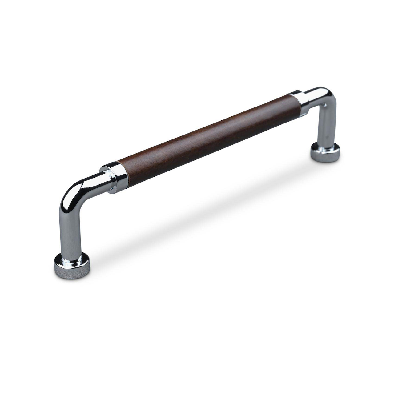Dette håndtaket fra Theofils har en klassisk krom utførelse, og er svøpt i brunt lær. Håndtaket bidrar til et elegant utrykk på skuffe- og dørfrontene dine.