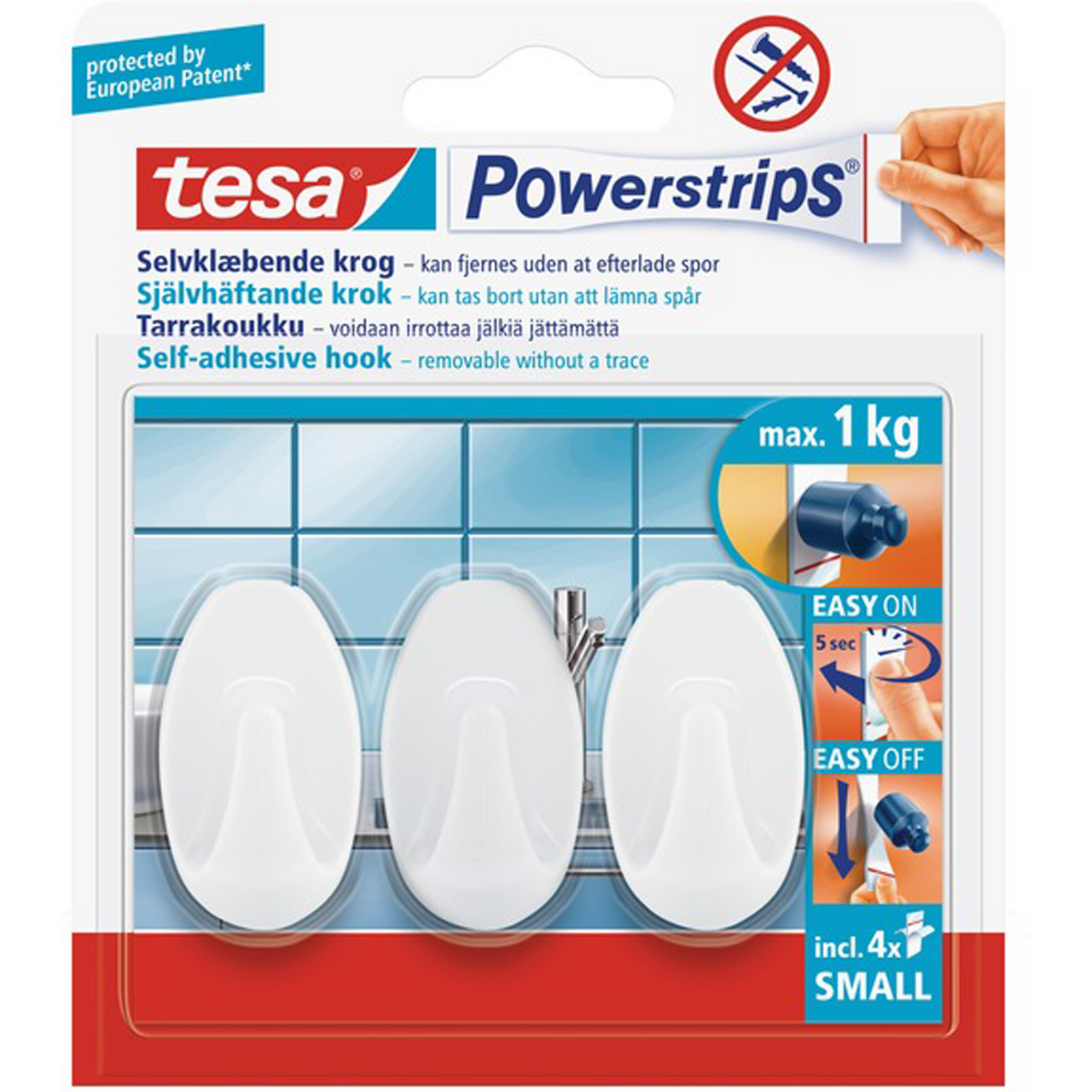 Festes enkelt på glatte overflater og kan fjernes når som helst uten merker eller limrester, og brukes på nytt med nye Powerstrips.