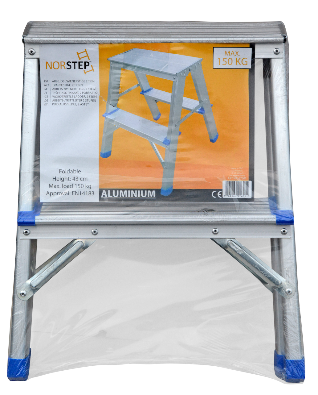 Sammenleggbar arbeidstrinn/kjøkkenstige. 2 x 2 trinn Aluminium. Med sklisikre trinn og plate. Høyde: 430mm. Øverste trinn: 340x180mm. EN131