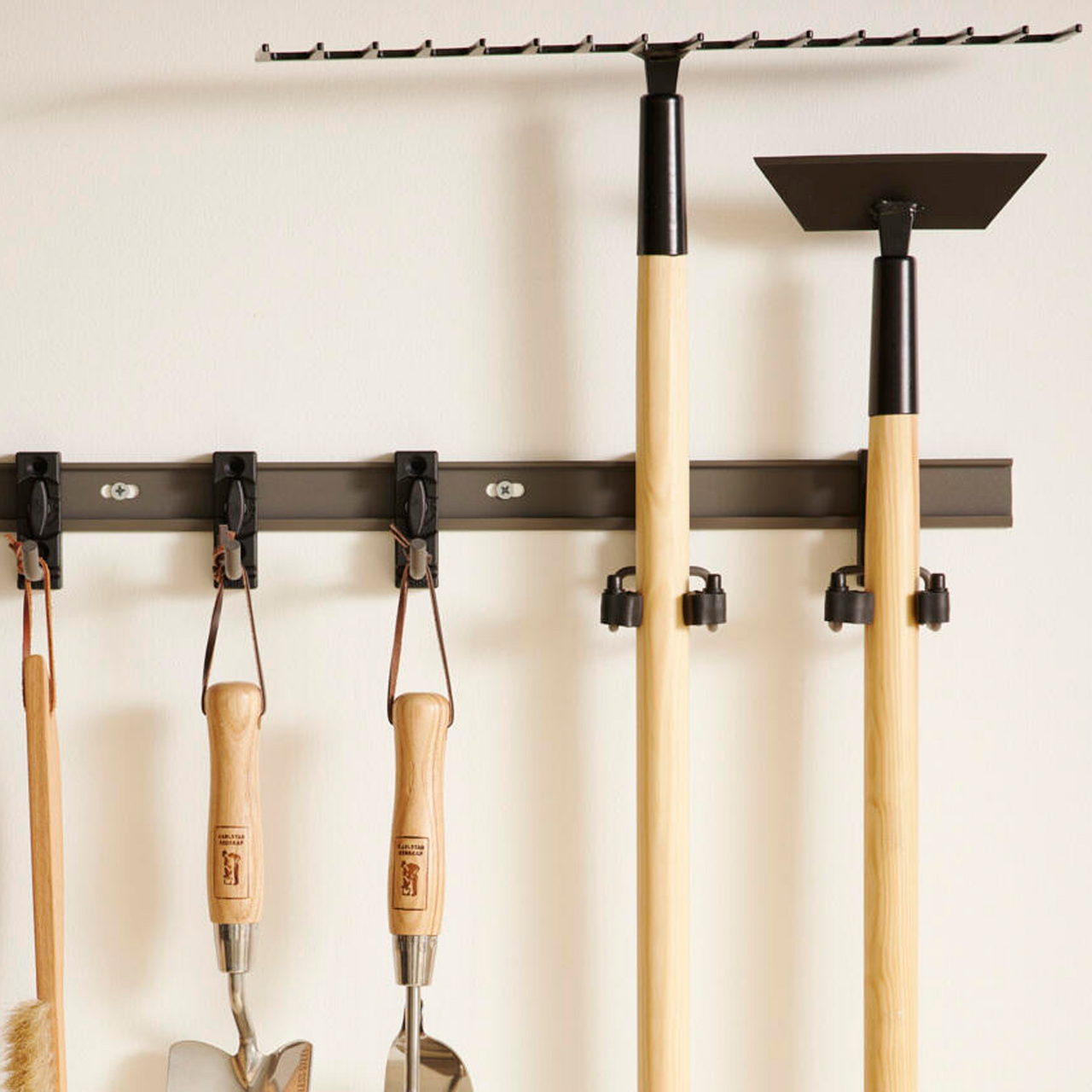 Den kan monteres mellom hengeskinner eller direkte på veggen, og kombineres med solide kroker for fleksibel oppbevaring. Velg blant tilbehør som J-krok, meshkurv for list og sykkelkroker for å skreddersy løsningen. For ekstra tunge belastninger over 10 kilo kan listen forsterkes med en ekstra skrue.