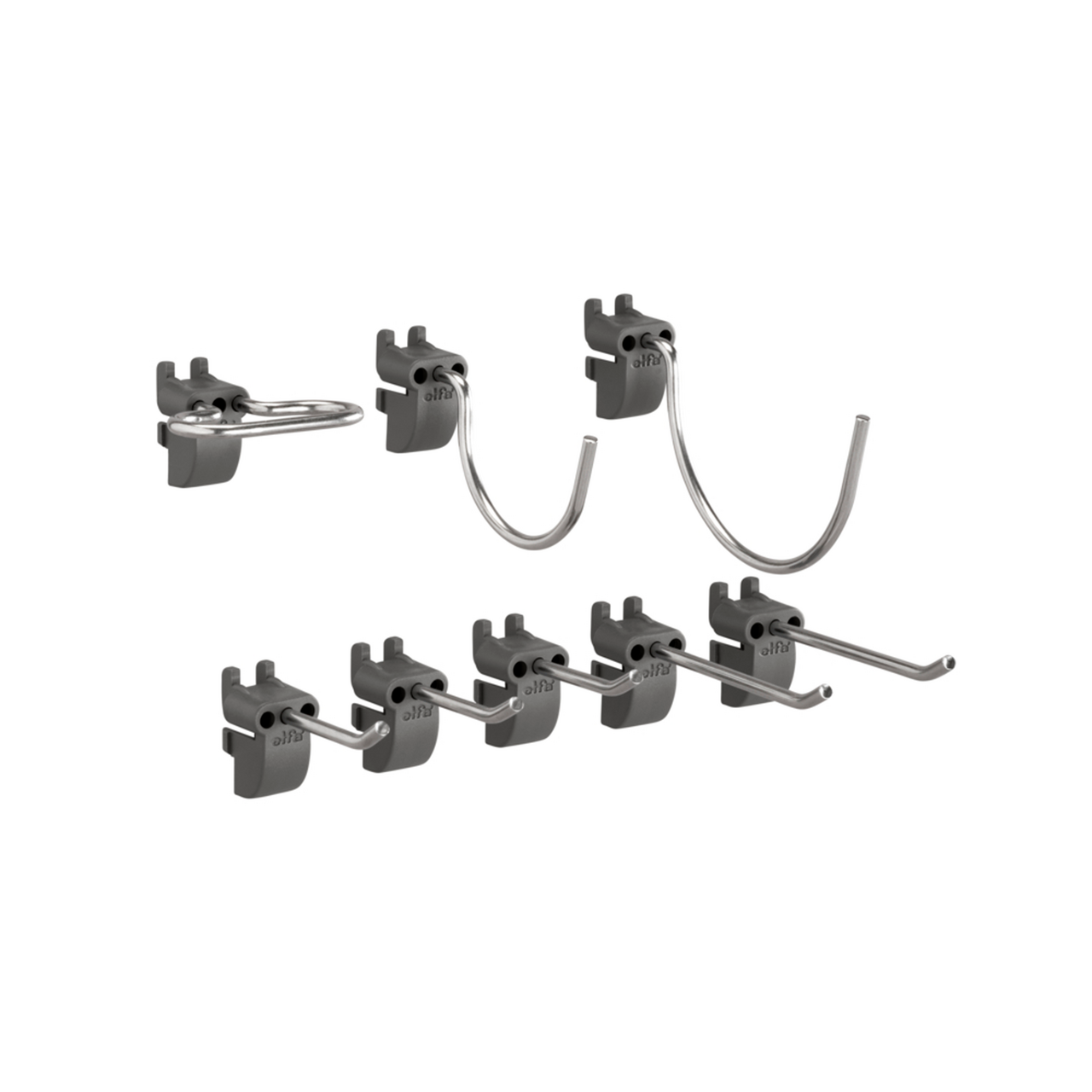 Settet består av 3 korte verktøykroker, 2 lange verktøykroker, 1 stor rund krok, 1 liten rund krok og 1 holder for fastnøkler. Ideell for å skreddersy oppbevaringstavlen og holde arbeidsplassen ryddig, oversiktlig og effektiv.