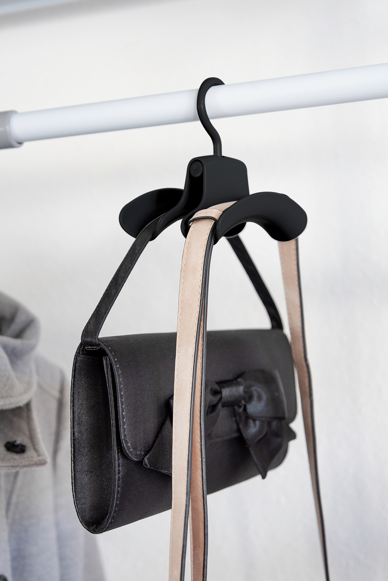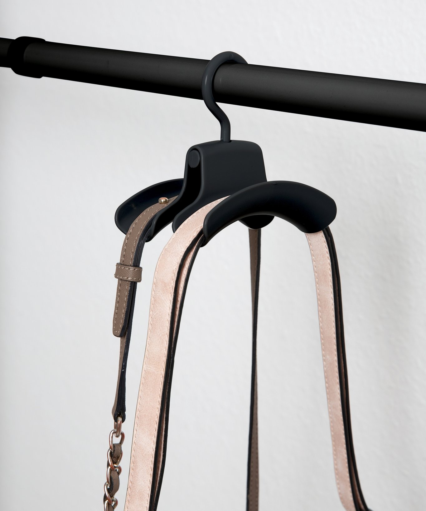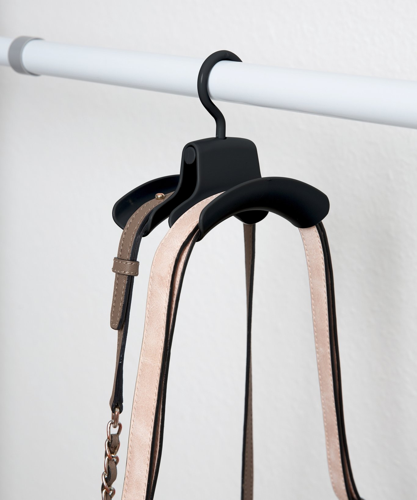 Praktisk veskeoppheng med brede kontaktflater som er ideelle til å henge opp og oppbevare håndvesker. To håndvesker eller ryggsekker passer på en dobbel krok.