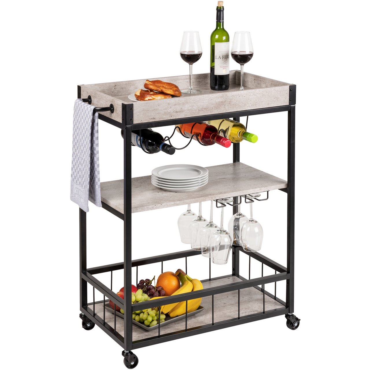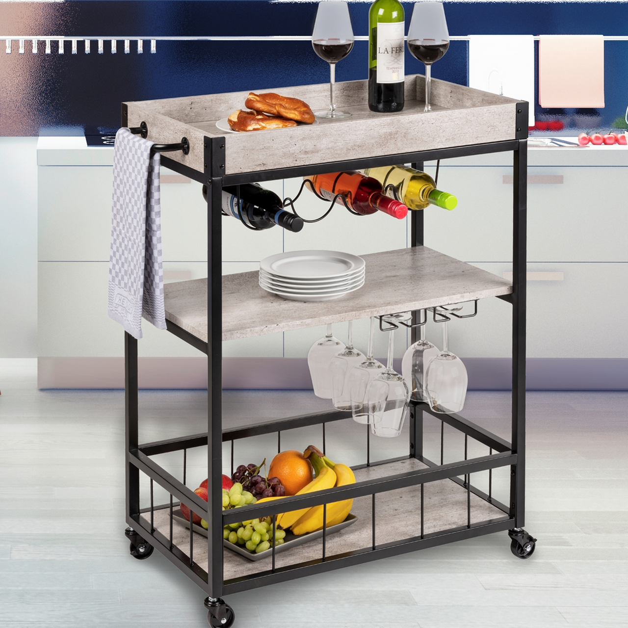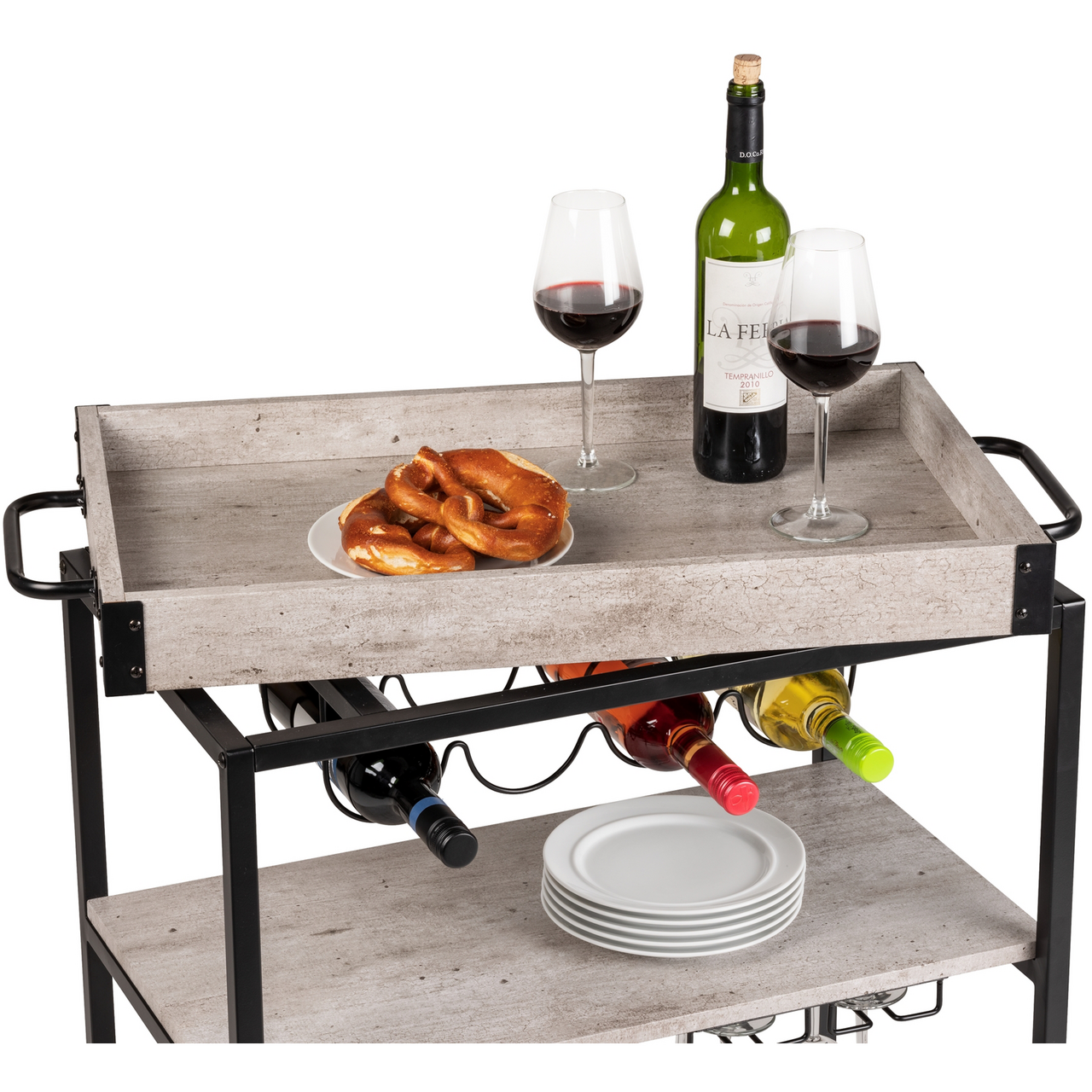 Med sine tre hyller, en egen flaskeholder og en ekstra glassholder, tilbyr denne stilige allround-vognen både sjenerøs og dekorativ oppbevaring og transportmuligheter for kjøkkenet, spisestuen, stuen eller terrassen og balkongen.