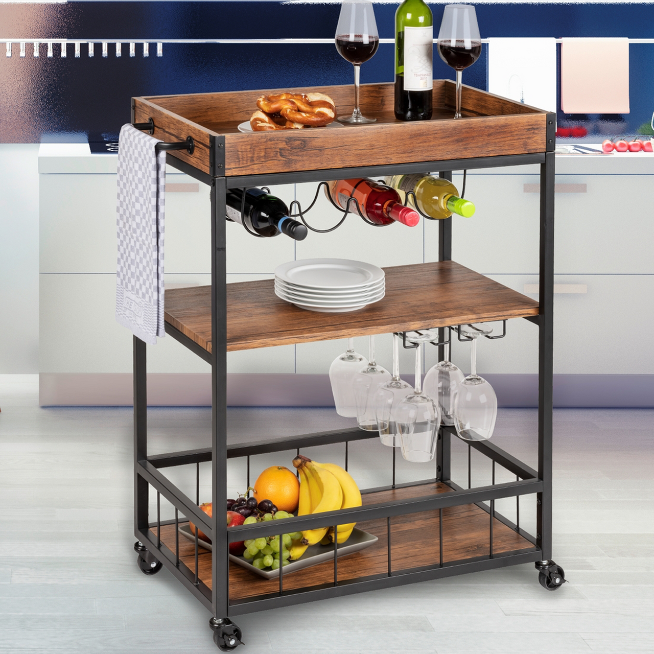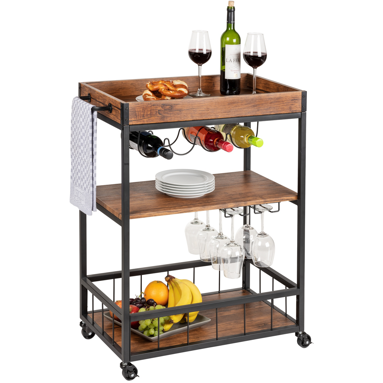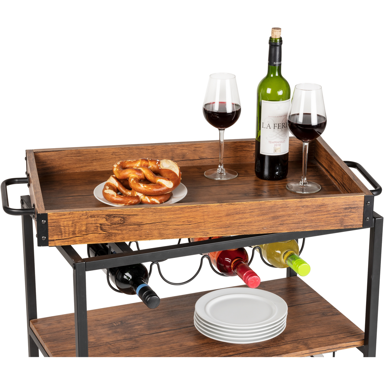 Med sine tre hyller, en egen flaskeholder og en ekstra glassholder, tilbyr denne stilige allround-vognen både sjenerøs og dekorativ oppbevaring og transportmuligheter for kjøkkenet, spisestuen, stuen eller terrassen og balkongen.