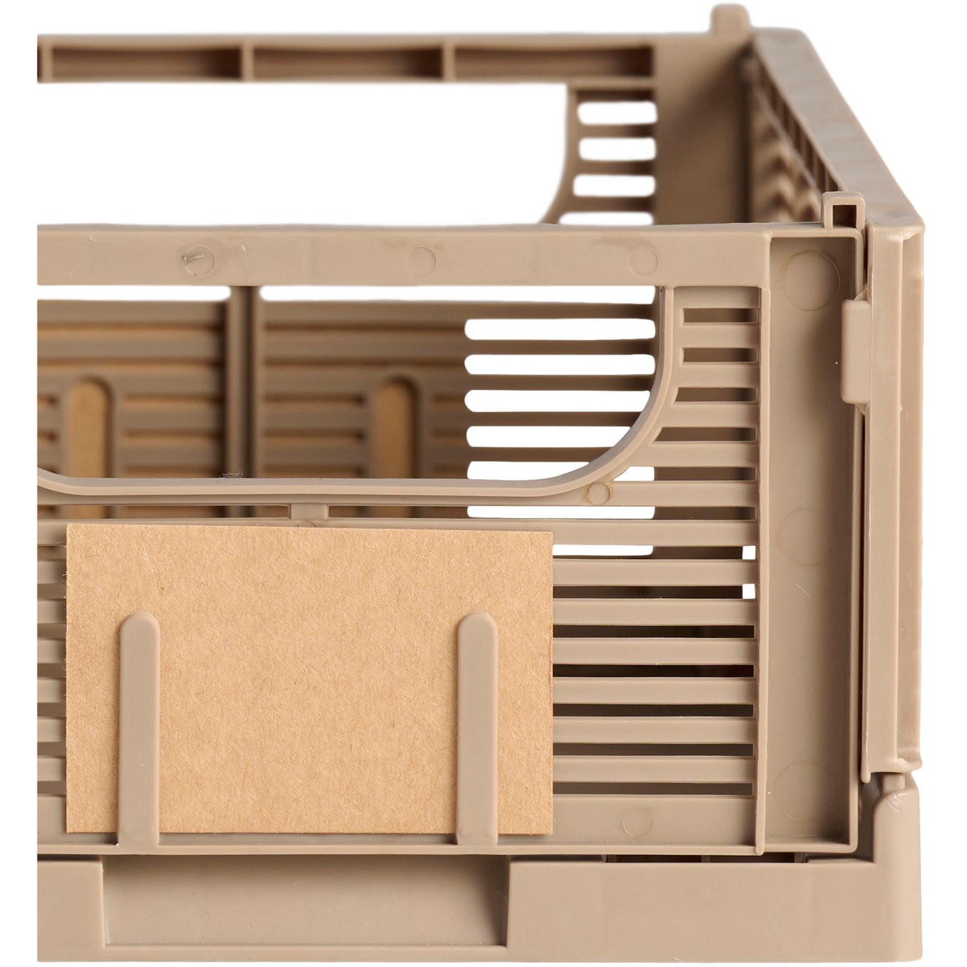 Den sammenleggbare kassen kan enkelt stables oppå andre sammenleggbare kasser. Den leveres med etiketter til å skrive på. Kassen finnes i flere farger og størrelser.