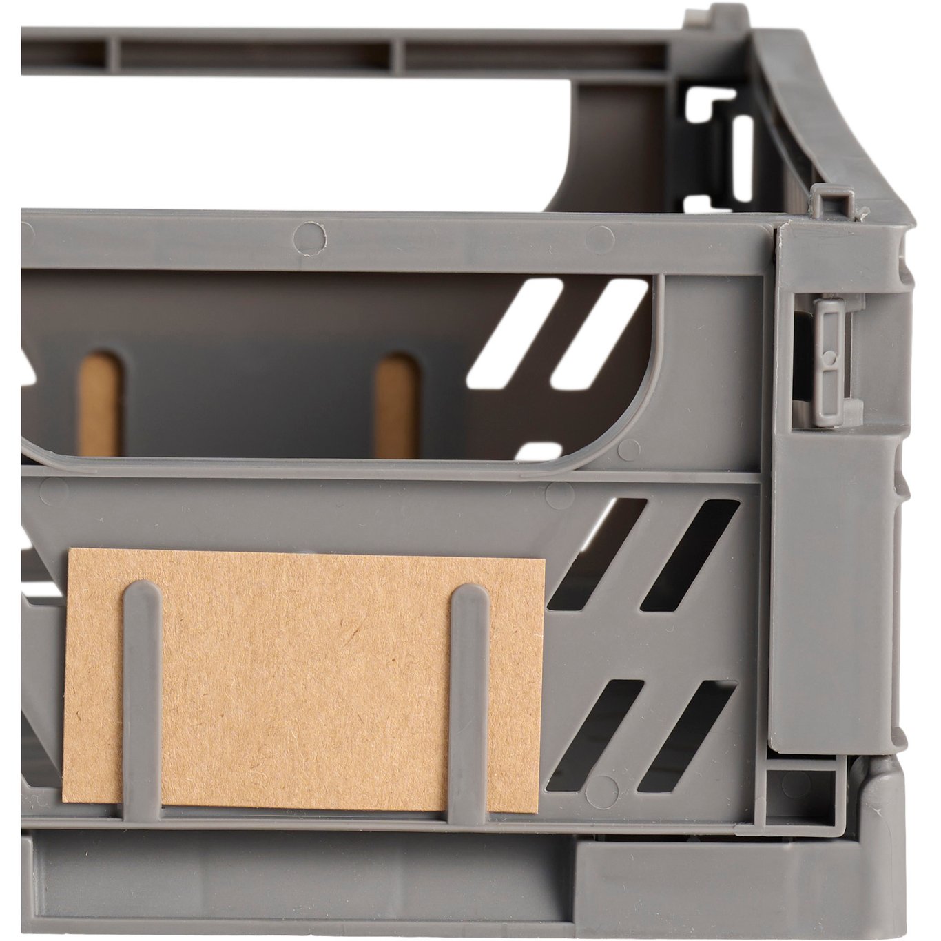 Den sammenleggbare kassen kan enkelt stables oppå andre sammenleggbare kasser. Den leveres med etiketter til å skrive på. Kassen finnes i flere farger og størrelser.