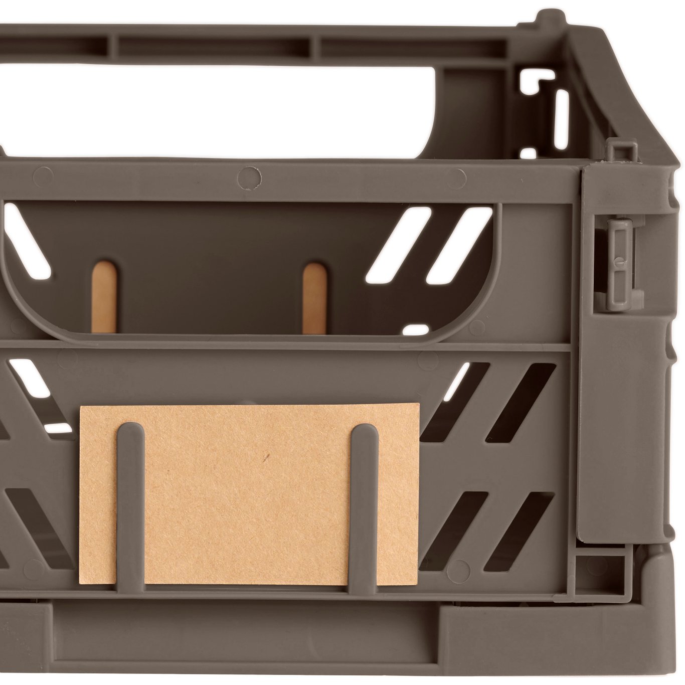 Den sammenleggbare kassen kan enkelt stables oppå andre sammenleggbare kasser. Den leveres med etiketter til å skrive på. Kassen finnes i flere farger og størrelser.