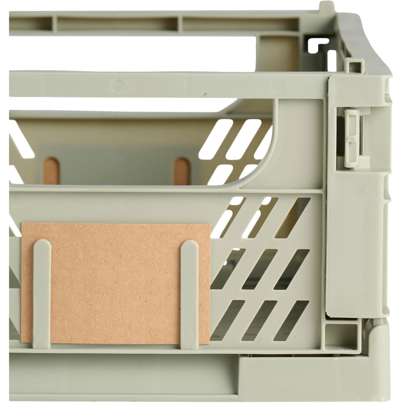 Den sammenleggbare kassen kan enkelt stables oppå andre sammenleggbare kasser. Den leveres med etiketter til å skrive på. Kassen finnes i flere farger og størrelser.
