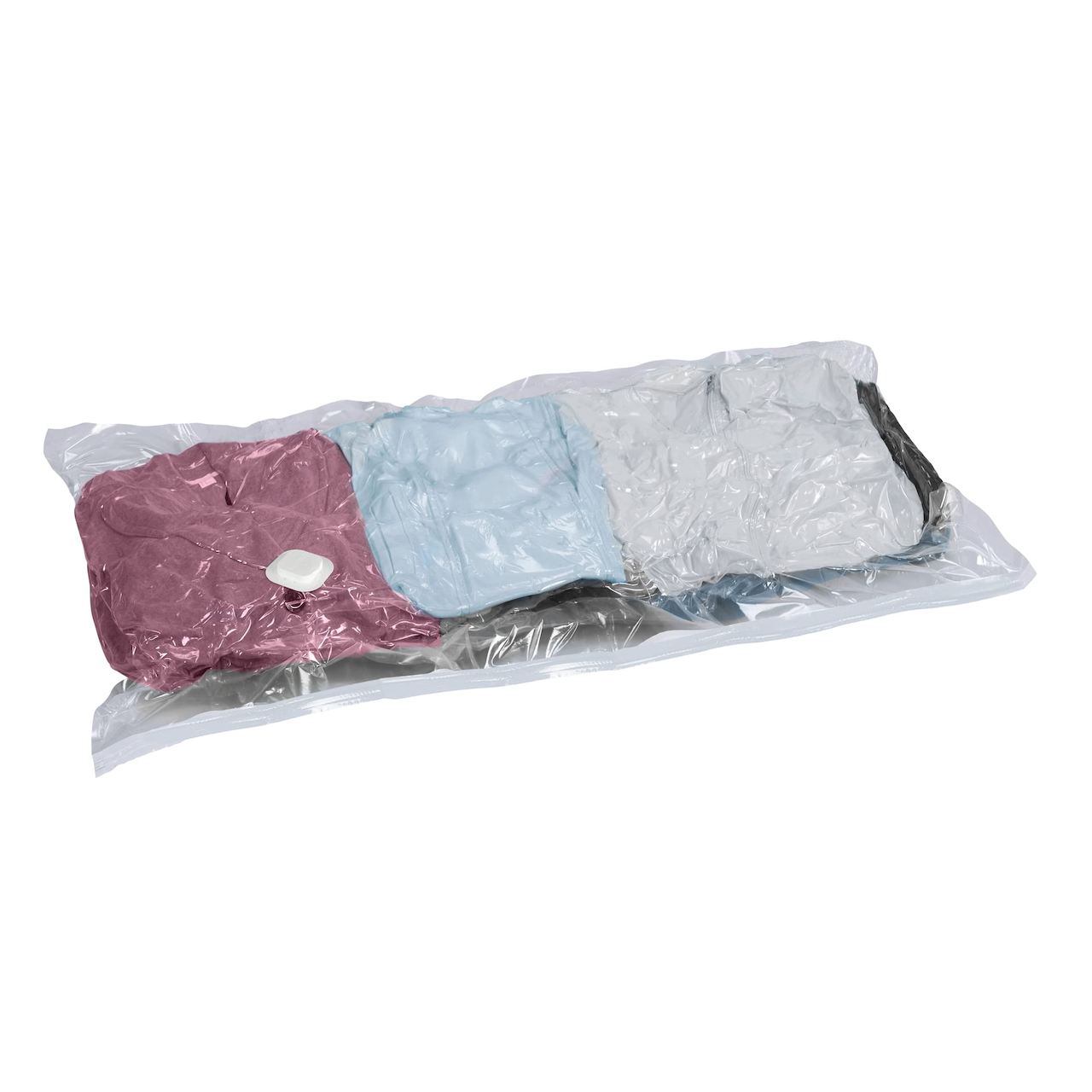 Med denne vakuumposen løses plassproblemet raskt. Bare legg klærne i posen, lukk posen og trekk ut luften med hjelp av en støvsuger og ekspressventilen. Så enkelt får du minsket utgangsvolumet med 75%