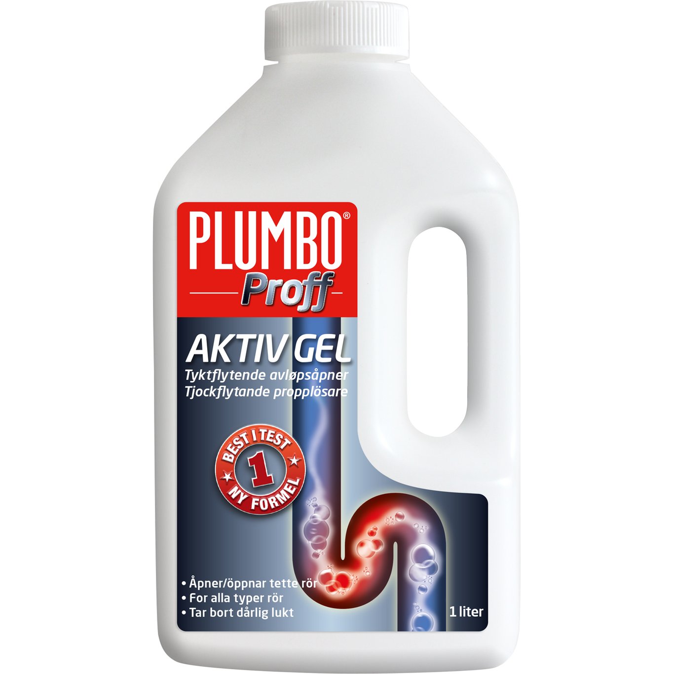 Plumbo Avløpsåpner Aktiv Gel proffversjon er en sterk, tung og tyktflytende gel avløpsåpner. Den er ekstra godt egnet på baderom og avløp med lite fall, og kan også brukes i toaletter.
