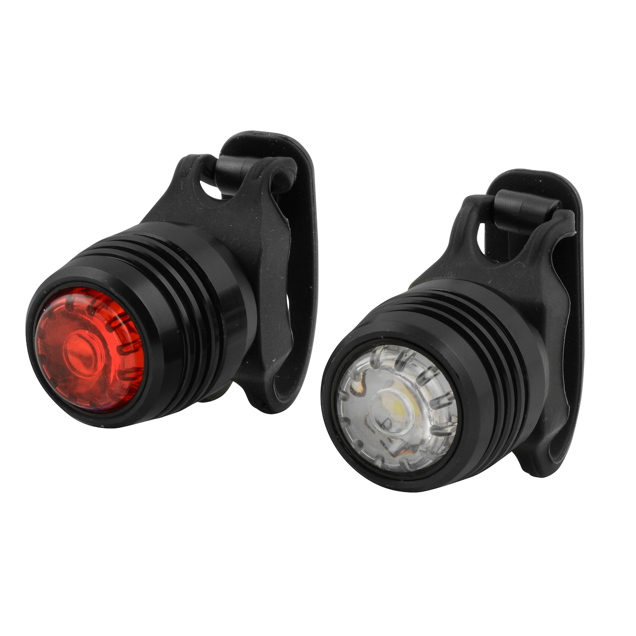 Sett med 2 stk. oppladbare sykkellykter. De kan brukes enten med blink, eller med konstant lys.