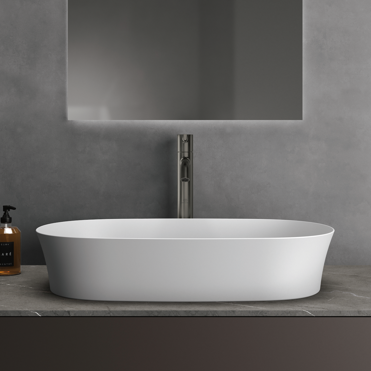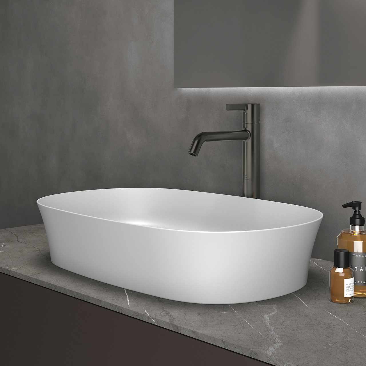 Servanten har en glatt overflate som gjør det enkelt å rengjøre og den kan enkelt monteres direkte på en benkeplate. Sammen med et høyt servantbatteri vil den skape et elegant uttrykk på baderommet.