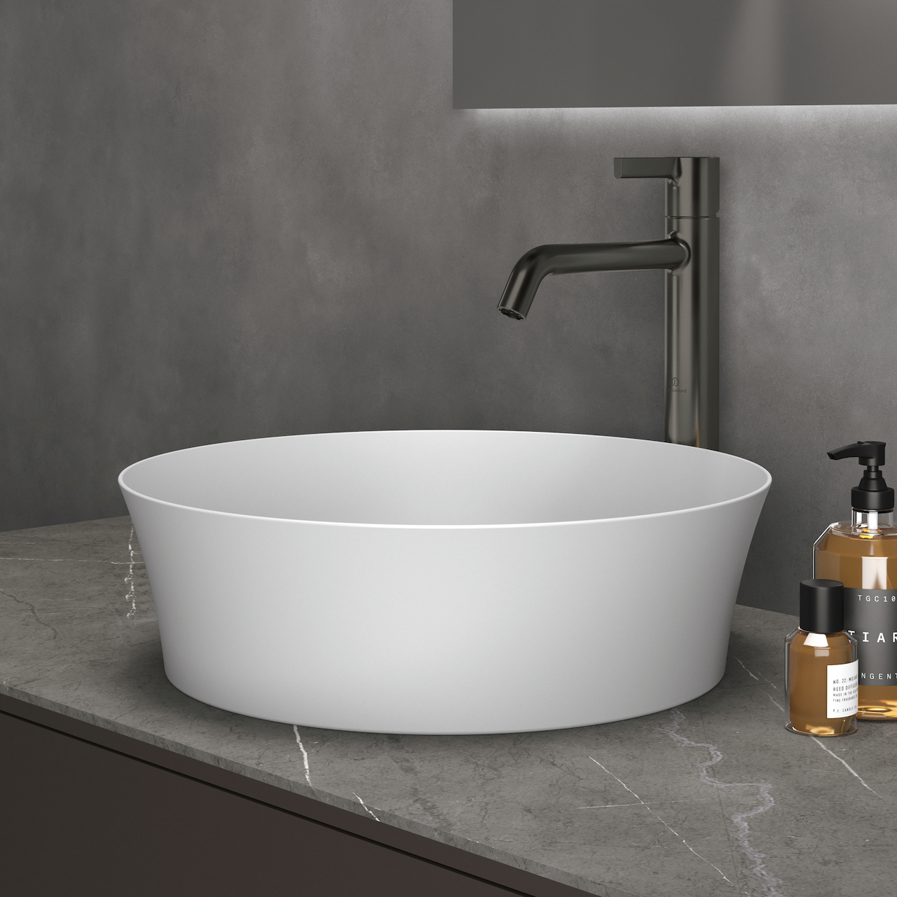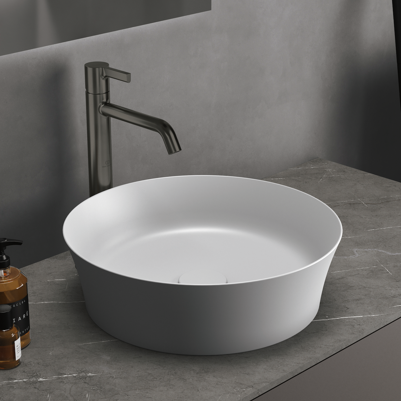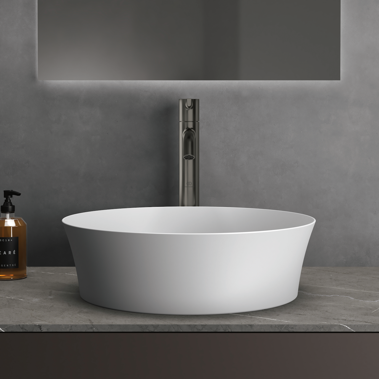 Servanten har en glatt overflate som gjør det enkelt å rengjøre og den kan enkelt monteres direkte på en benkeplate. Sammen med et høyt servantbatteri vil den skape et elegant uttrykk på baderommet.