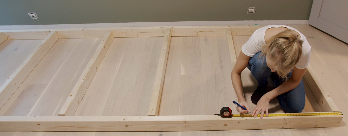 Spileplatene er 60 cm brede, og for å slippe å kappe de i bredden så ble valget å lage 3 m bredt rammeverk. På den måten ville spilekonstruksjonen dekke mer enn bare kun sengen (noe som er en fordel om man vil montere nattbord direkte på spileplatene). Toppsvill og bunnsvill ble derfor 3 m, mens lengden på stenderne ble satt ut ifra høyden vi ønsket på rammeverket. Obs! Husk at topp- og bunnsvill er med i den totale høyden.