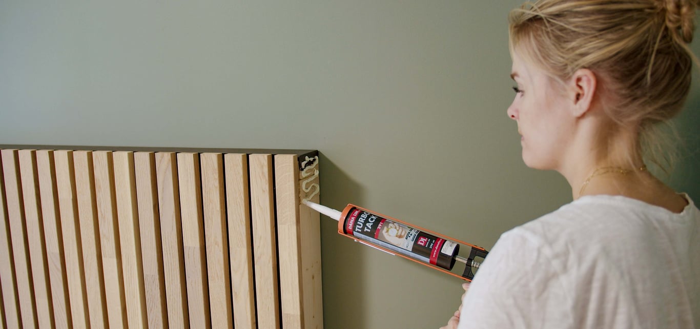 Spilen på hjørnet kappet vi med 45 graders kutt i topp, slik at det ble en fin avslutning mot listen som vi la på topp med samme kutt. Topplisten (her brukte vi gulvlist til spiler) limte vi også på plass, men her punktlimte vi kun overgangen mellom MDF-platen og spilene, slik at det ikke ville tyte ut lim i front.