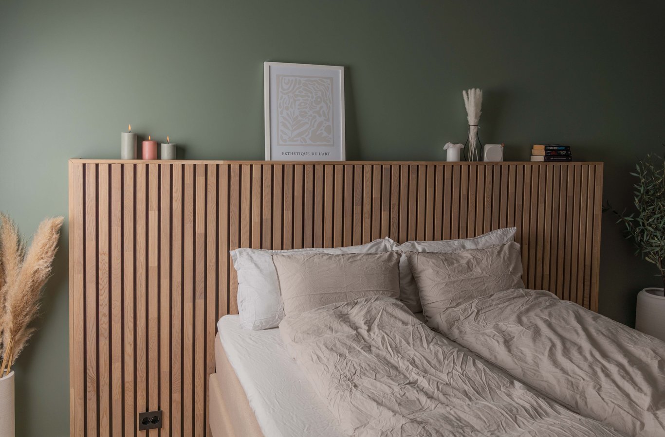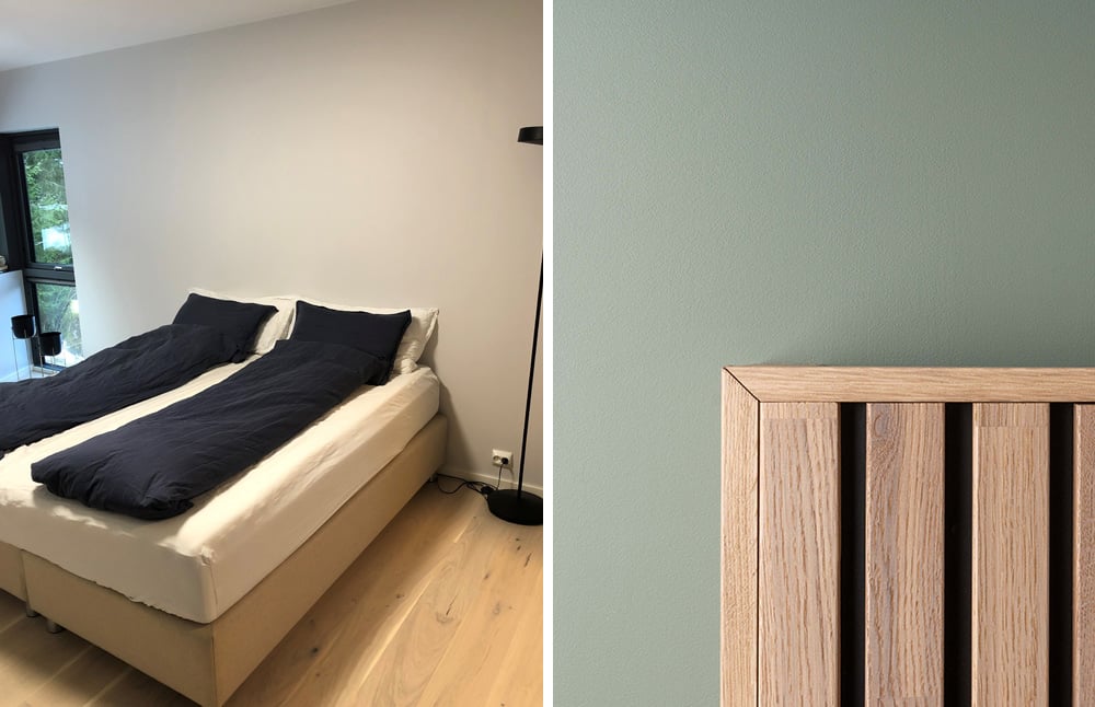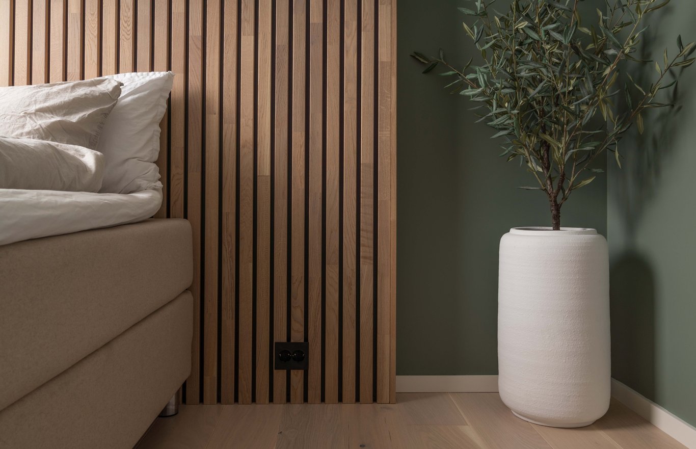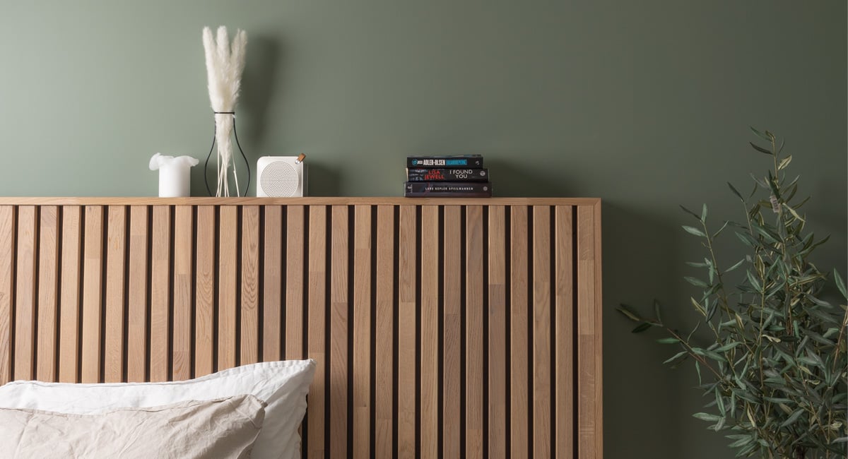 Spiler av eik eller eikefoliert MDF er utrolig lekkert å kombinere med grønnfarger. Til dette prosjektet har vi derfor transformert et relativt sterilt soverom med lysegrå vegger, til et moderne og lunt rom ved bruk av spiler kombinert med grønnmaling (Antique green, med maling fra Nordsjø). Ønsker du å gå for en røffere look så kan du hente igjen den mørke, sorte fargen fra MDF-platene på veggene.