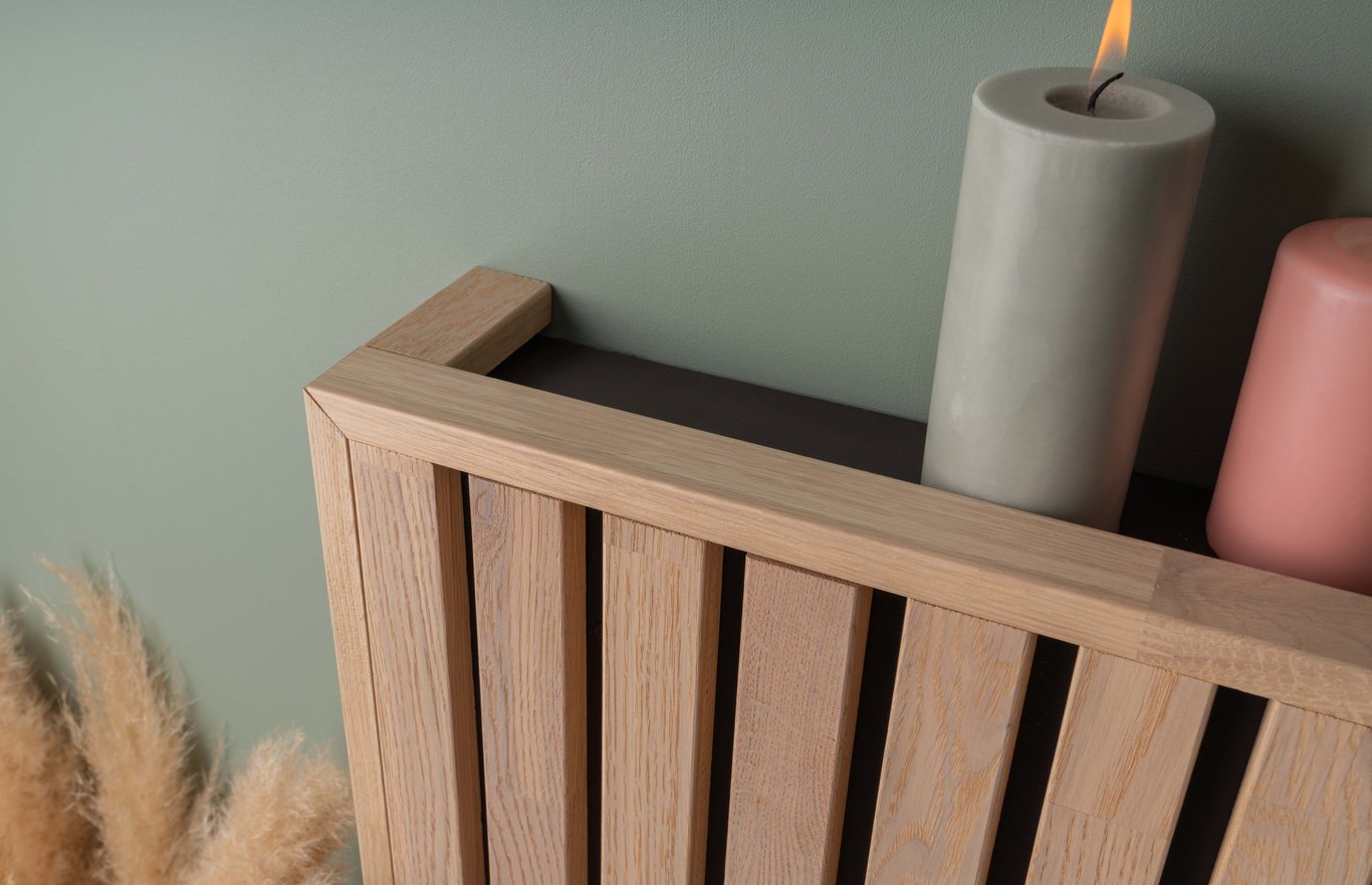 Når selve fronten er kledd med spileplatene må sidene også fikses. Vi valgte å fjerne spiler fra en plate, kappe de i riktig høyde, for så å lime de på sidene. Dette var en god løsning da dybden på rammeverket var akkurat nok til å få til tre spiler i bredden. Dersom du også velger å lime, sørg for å velge et hurtigtørkende og sterkt lim, og prøv å unngå at det tyter lim ut på sidene.