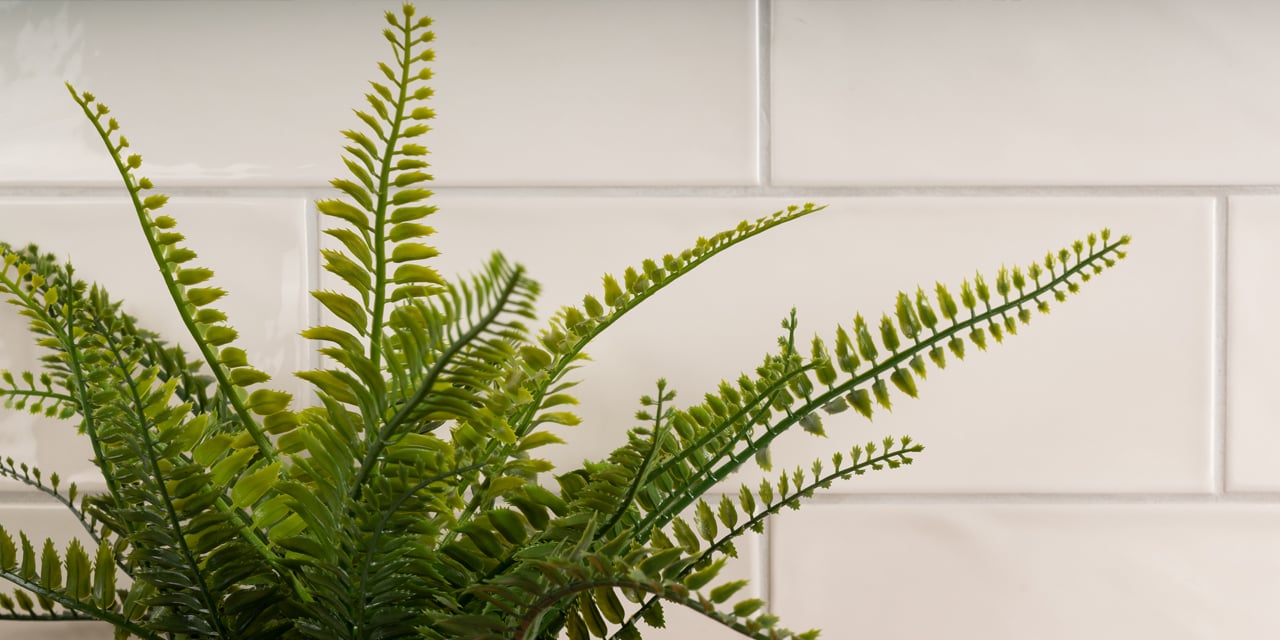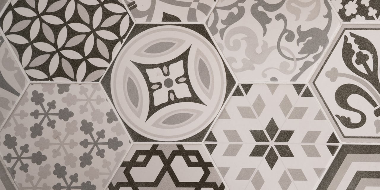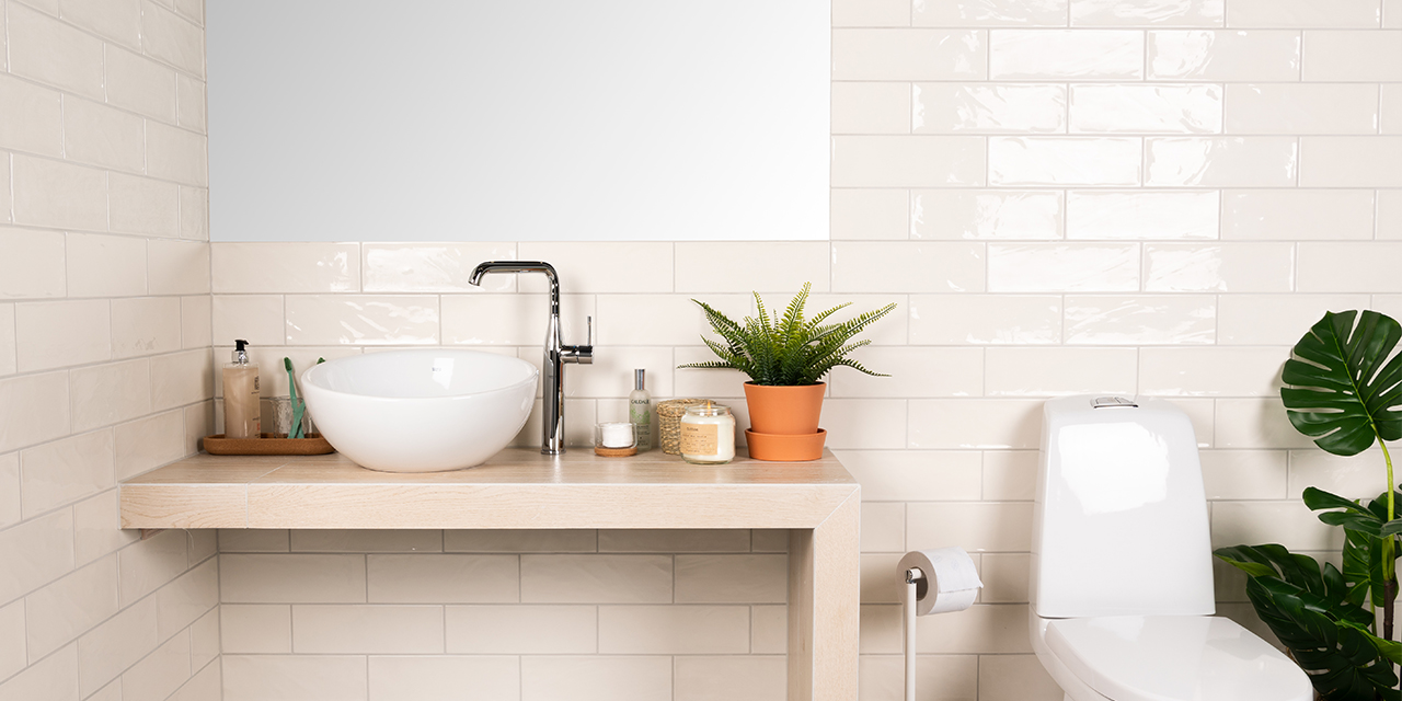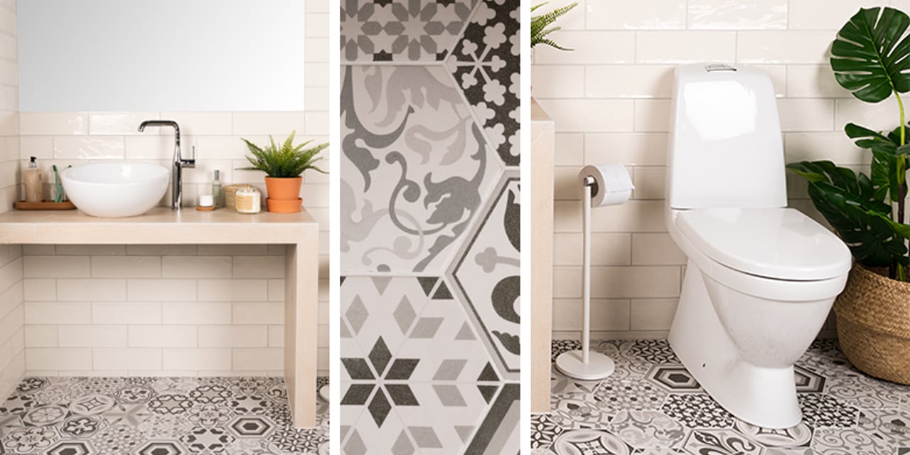 Katrine har denne gangen valgt å kombinere hexagonfliser (6-kantede fliser) med historisk mønster og subwayflis med en matchende tone. Tilbehøret er grønne planter, tre og terrakotta. Naturlig og behagelig.