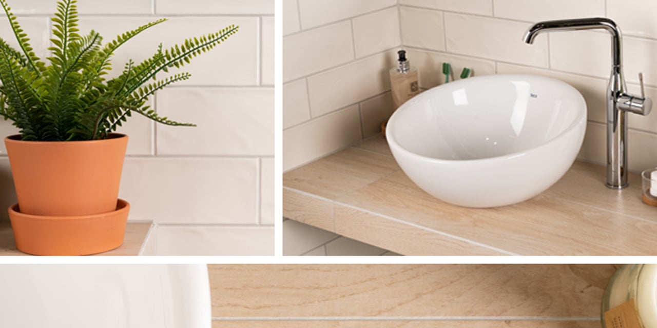 L-Benken er bygget av Tetti-plater og er belagt med trestrukturerte fliser som står til den øvrige stilen.