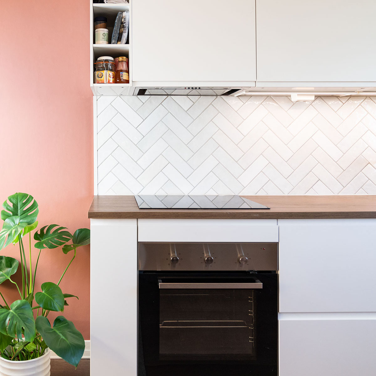 Med smale flis lagt i fiskebensmønster bak kjøkkenbenken skaper du straks et nytt uttrykk på kjøkkenet ditt. I tillegg til å være et fint element på kjøkkenet er det også praktisk, da det gjør det enklere å rengjøre veggen bak benken etter matlagingen.