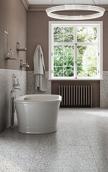 Terrazzo er en gammel tradisjon som kan spores helt tilbake til Venezia på 1400-tallet. Terrazzo-mønsteret har nå blitt populært igjen, og du finner det på alt fra gulv- og veggfliser til kopper og tallerkener. Med terrazzo-mønstrede fliser kan du enkelt gi rommet et trendy og utbant uttrykk.
