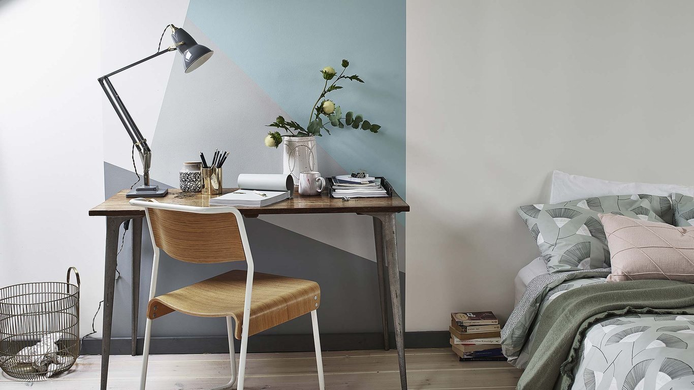 Dersom det er mangel på plass – er et skrivebord i soverommet en fin løsning for et arbeidshjørne. I soverommet nedenfor valgte vi å male dekorative triangler som er tilpasset etter målene på skrivebordet. En god malerteknikk å bruke når du vil laget en bestemt ramme i rommet.