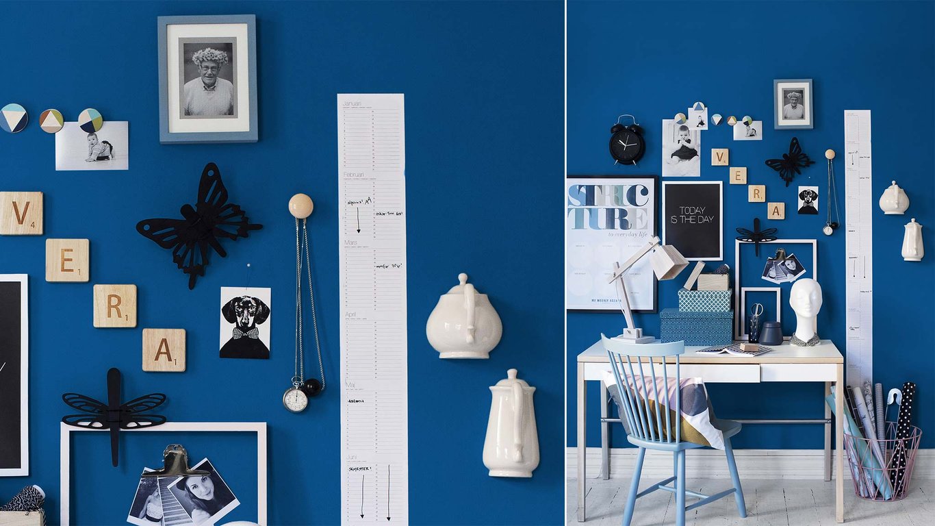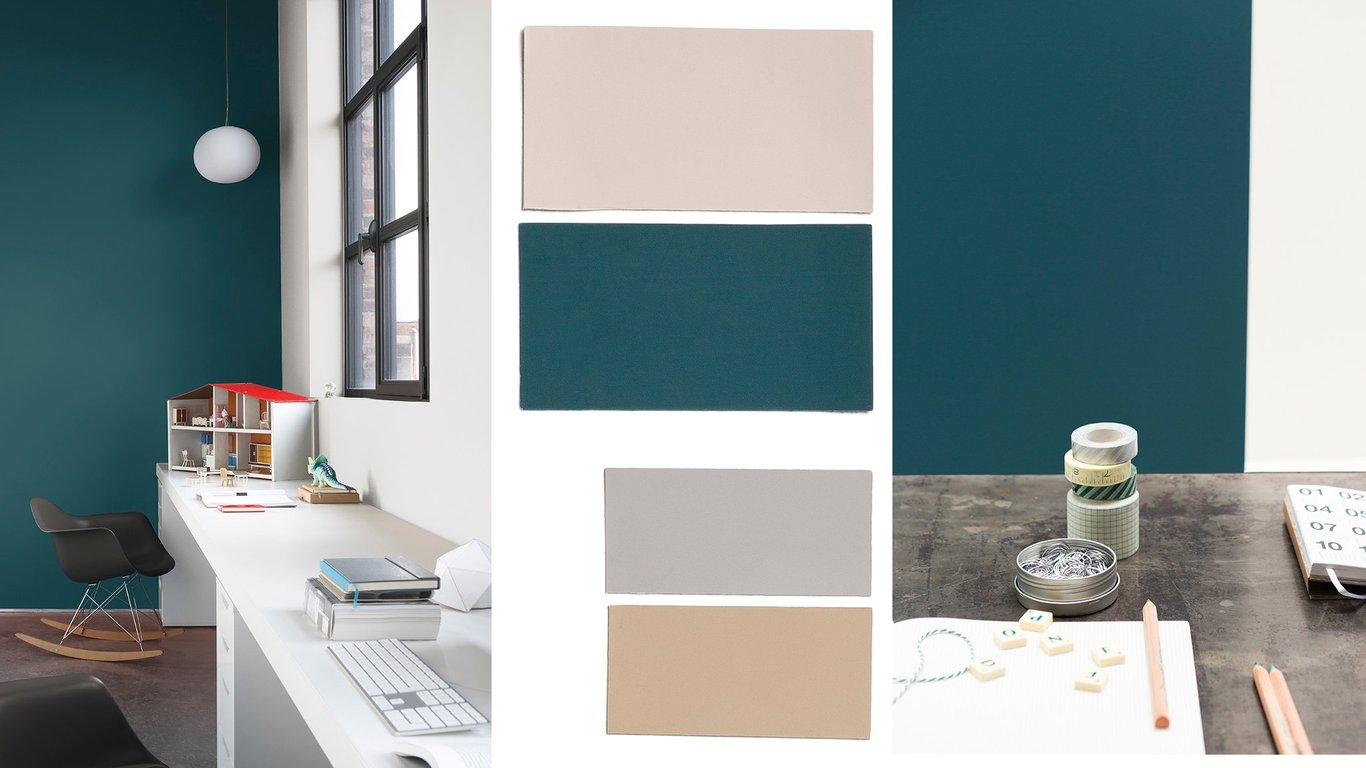 Her er fondveggen malt i den grønnblå fargen Teal fra Nordsjø. Fargen har både blå og grønne elementer, noe som gjør den til en utrolig fredfull farge som kan brukes sjenerøst på hjemmekontoret.Balansér med et lyst skrivebord, en moderne klassiker til å slå seg ned i, og friske detaljer i mintgrønn og sennepsgult.