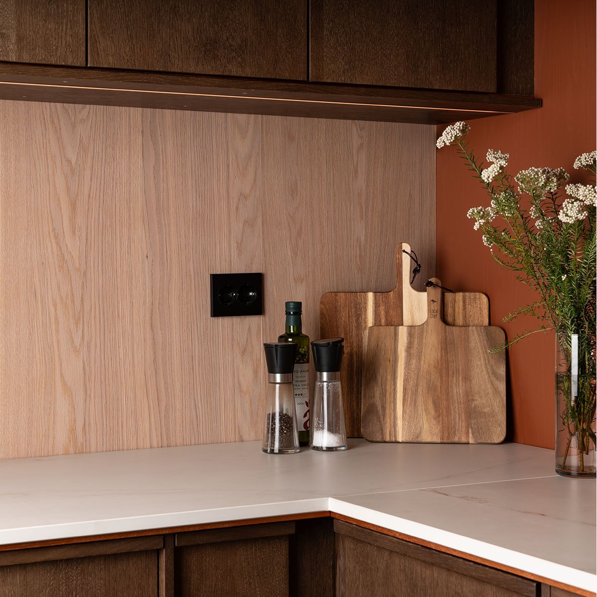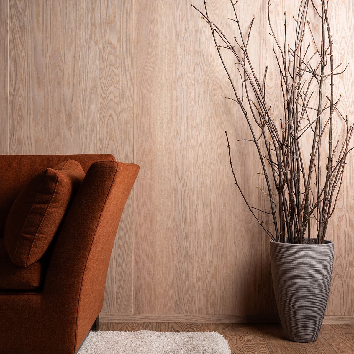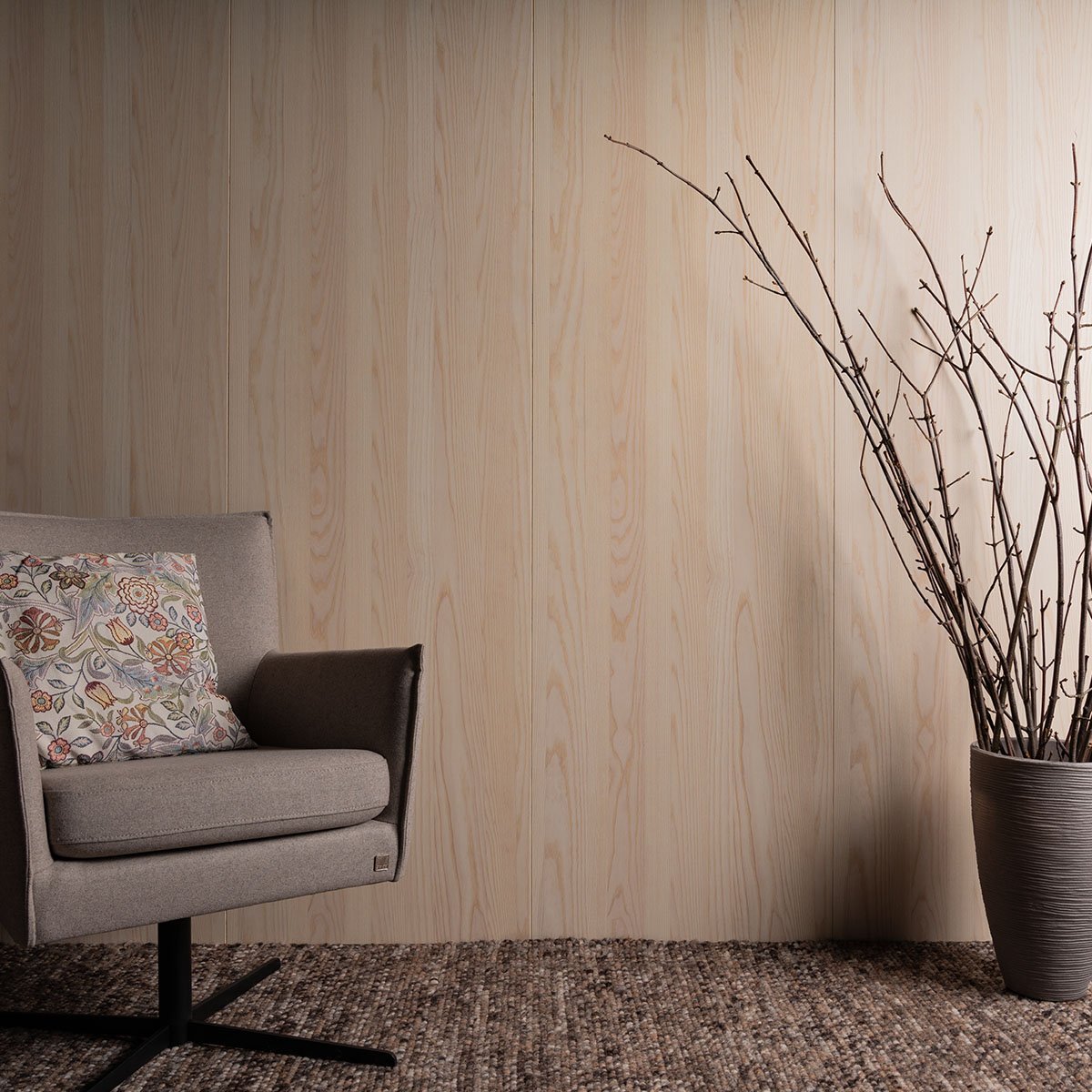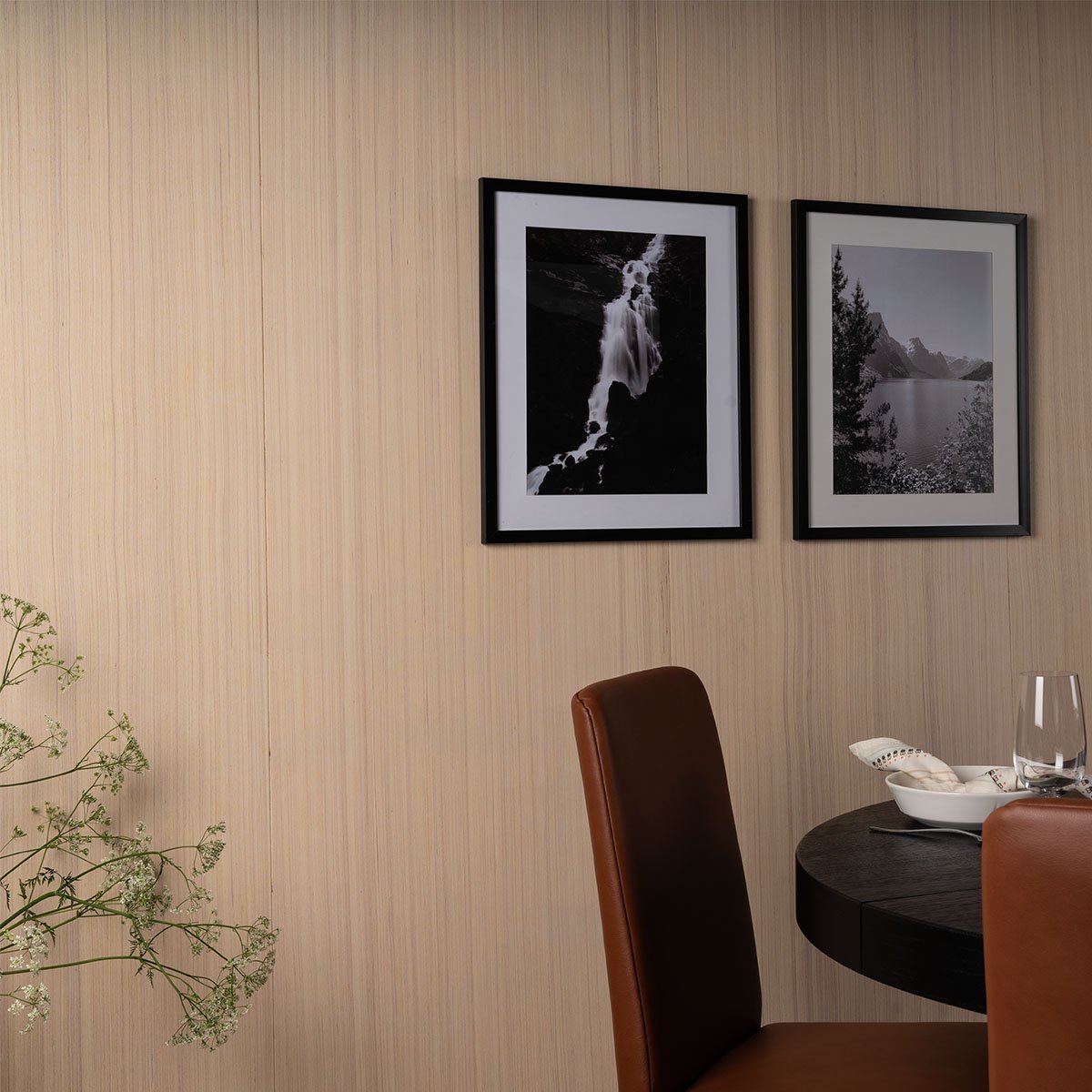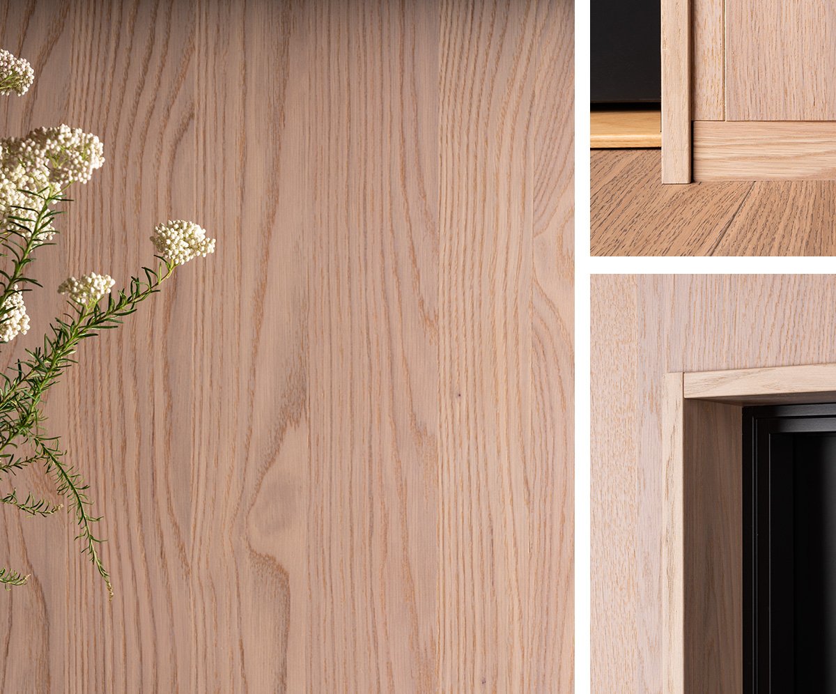 Montering av våre veggplater er både enkel og effektiv. Hver plate er presisjonsfrest med pen og not, som sørger for at platene passer perfekt sammen slik at skjøtene blir minimalt synlige. Dette gjør disse finerplatene ideelle både for vegg- og takinstallasjoner, og gir et helhetlig designuttrykk. Vi tilbyr også matchende utforinger til dører og vinduer, slik at du kan montere veggplatene direkte inn i utforingen. Dette eliminerer behovet for ekstra lister og gir en helhetlig og minimalistisk finish.