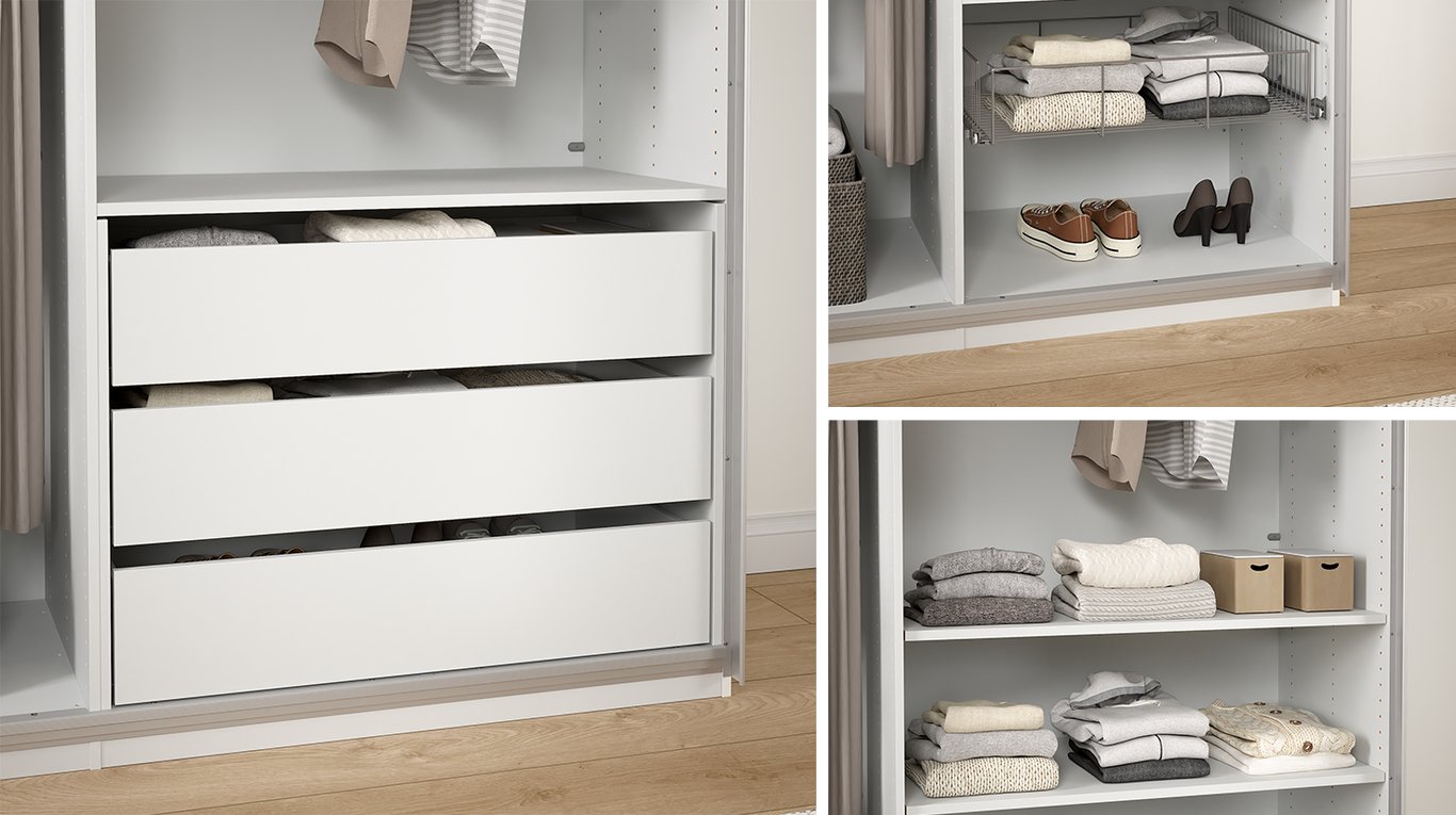 Velg mellom åpne løsninger som gir god oversikt, eller lukkede skuffer som skjuler småting og gir et ryddig uttrykk. Kombiner elementene slik at de passer dine behov og rommets størrelse, enten du innreder en kompakt entrégarderobe eller et romslig walk-in.