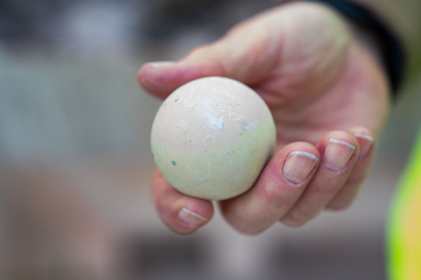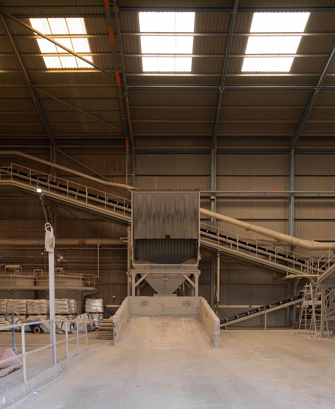 Under disse takene blir hvit leire og sand levert og oppbevart frem til det skal brukes i produksjonen av flis.