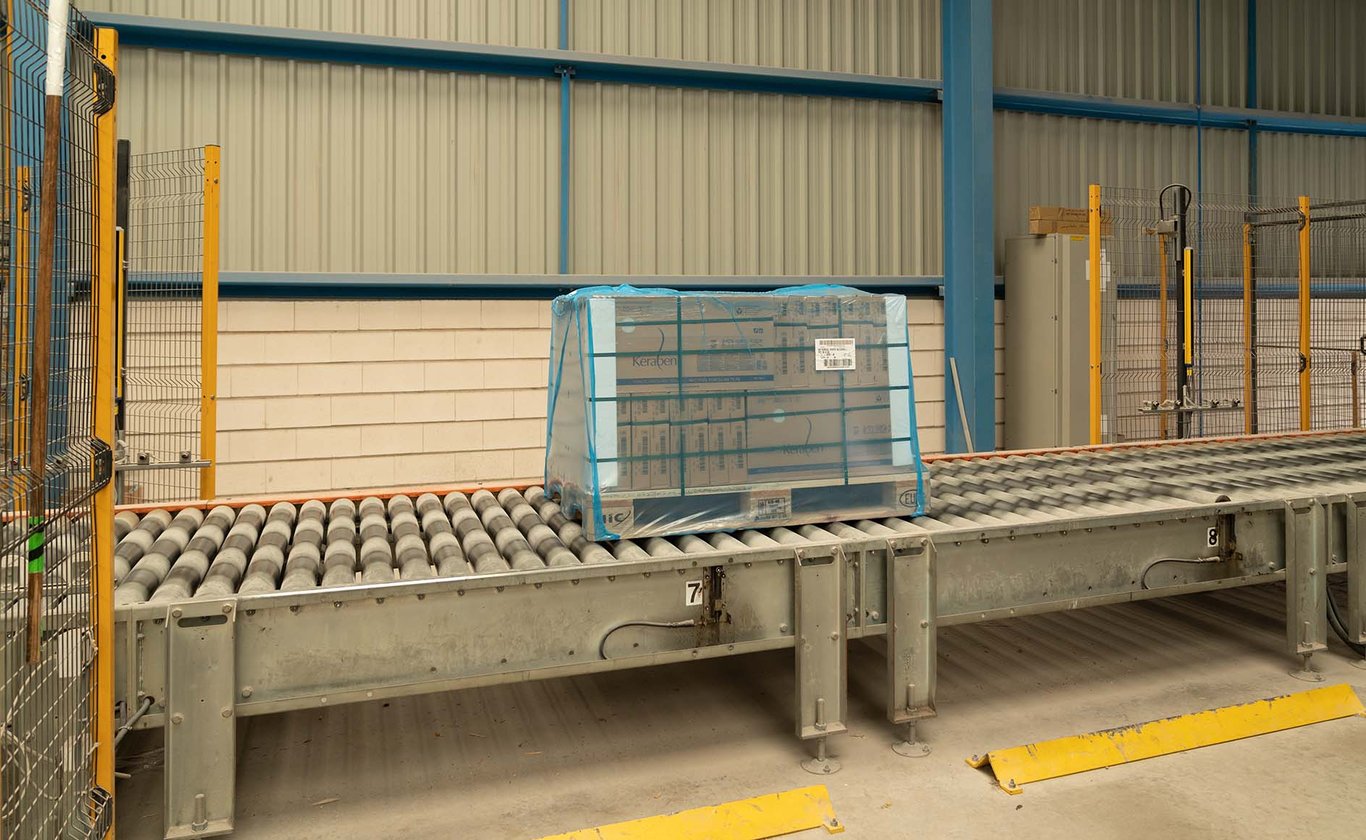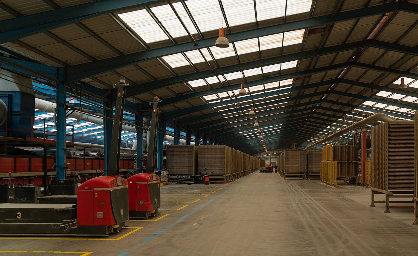 Nå blir flisene kontrollert og målt opp mot en flis fra den første godkjente produksjonen, før de blir transportert i vogner til ovnene for brenning. Vognene blir fraktet av røde palletrucker som blir styrt fra et kontrollrom.