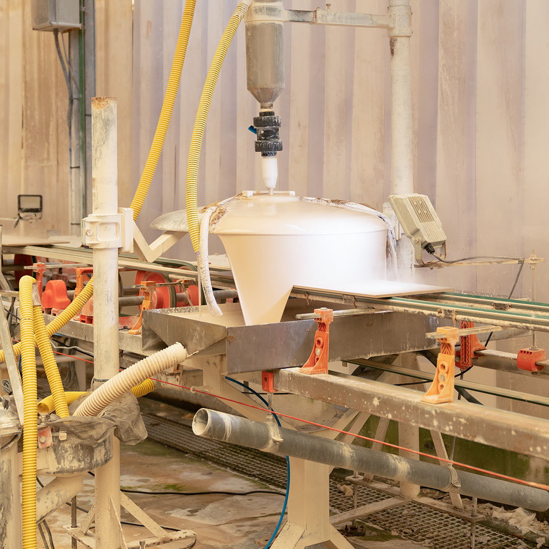 Når råvarene er ferdig bearbeidet og klar til produksjon blir den finkornete, myke sanden presset i en flisepresse, før den påføres en form for primer. Deretter påføres farge, design/mønster og glasur med en INKJET-maskin.