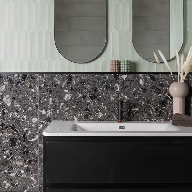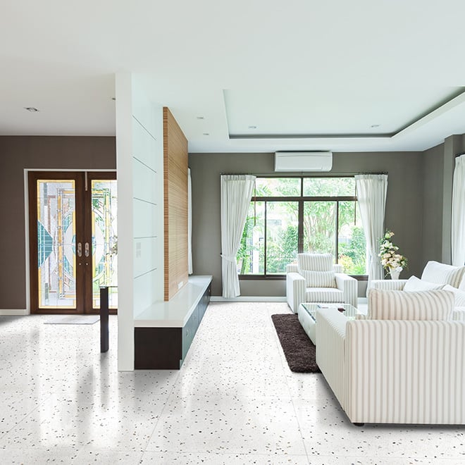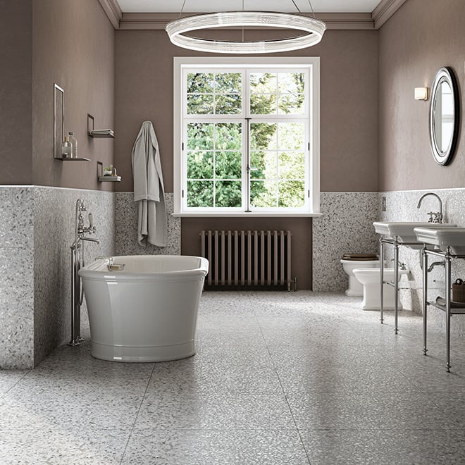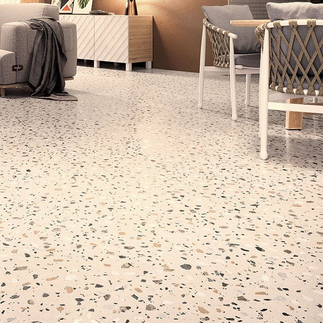 Fordelen med terrazzo-mønsteret er at selv om det har perioder det er veldig trendy, så er det fortsatt et tidløst mønster. Våre terrazzo-mønstrede fliser er slitesterke porcellanatofliser som er enkle å vedlikeholde. De kan kombineres med ulike elementer, og passer godt sammen med den skandinaviske minimalismen. Du kan bruke dem i entreen, på badet eller kjøkkenet, eller ute på terrassen. Her er det nesten bare fantasien som setter grenser!