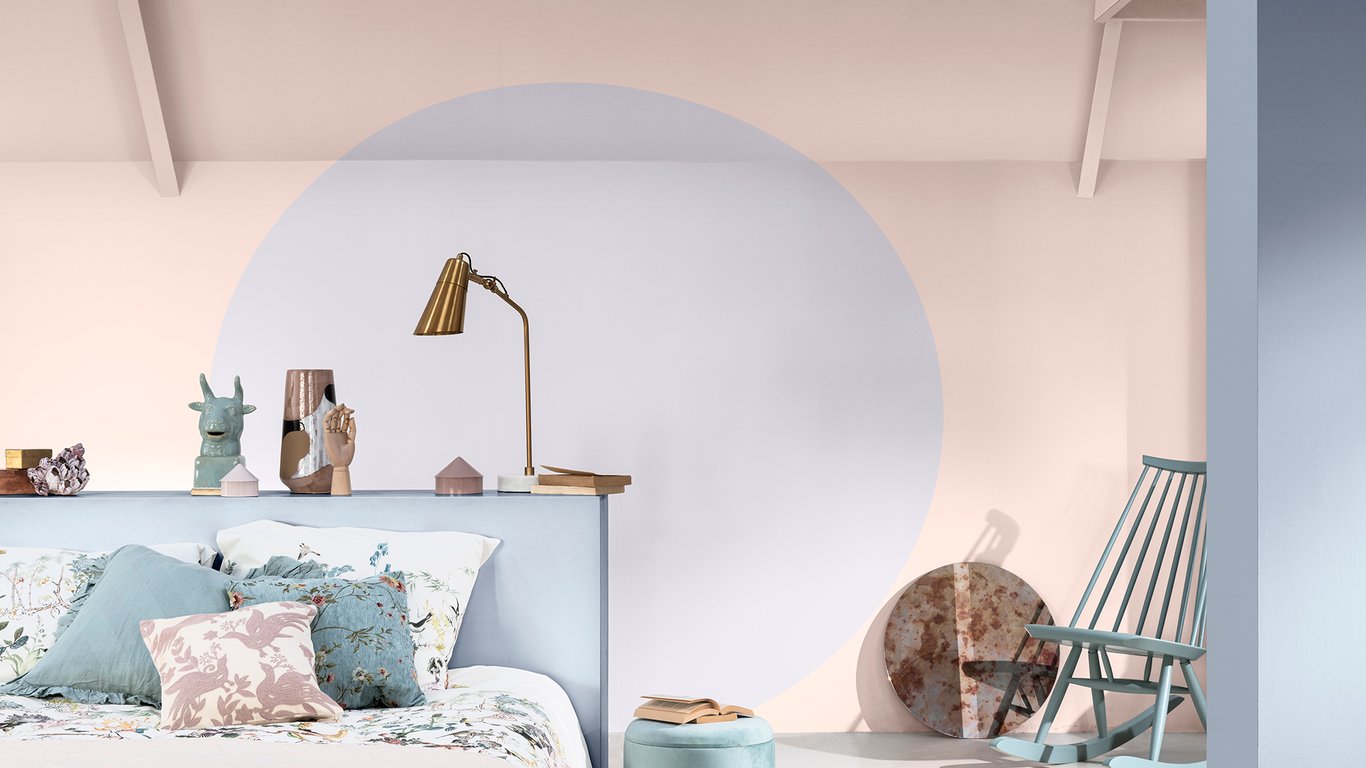 Myk, beroligende og litt glamorøs, Fargene i paletten fungerer strålende på et soverom. Lag en bokhjørne eller et sted å hygge deg på slutten av dagen ved å bryte opp med å male en sirkel i en komplementær farge. Blekrosa og syrin, rammet inn av de luftige fargene av Bright Skies™, skaper en ren og sober stil som både er sofistikert og avslappende.