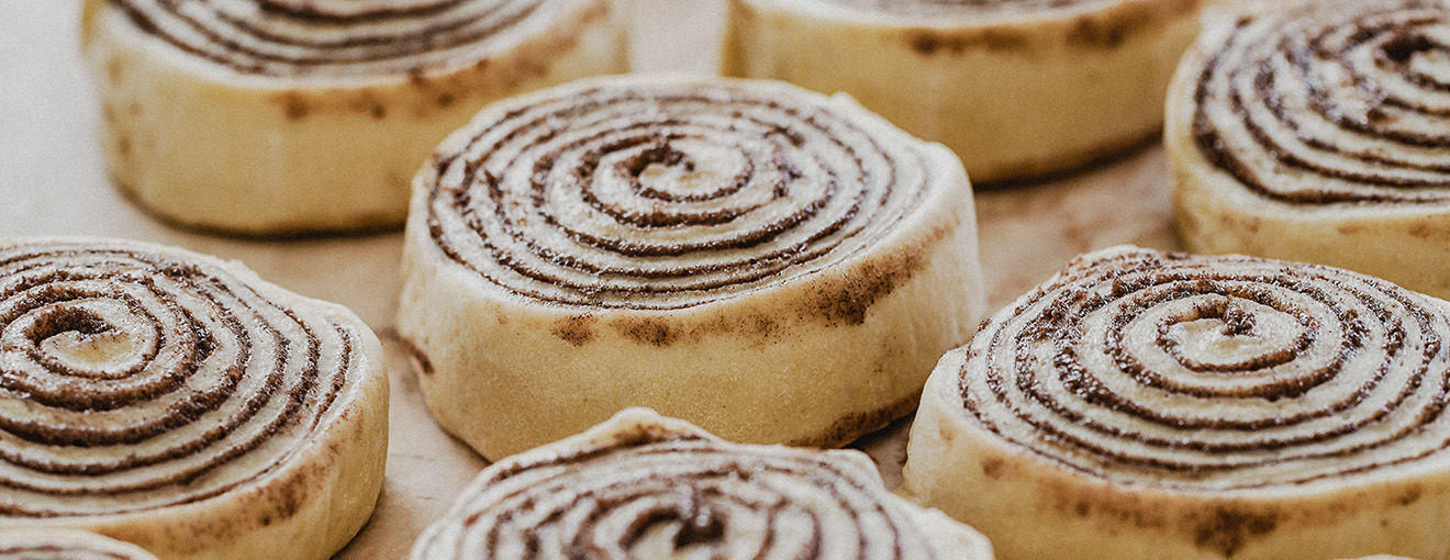 Når deigen er ferdighevet strør du litt mel utover benken før du heller deigen ut fra bollen og ned på benken. Gjerne kna deigen raskt med hendene før du kjevler den til et rektangel med en tykkelse på ca. 1 cm. Smør så fyllet utover, før du ruller deigen sammen til en pølse og skjærer skiver med en tykkelse på ca. 2-3 cm og legger de i en langpanne eller ildfast form. Dekk til med plastfolie eller kjøkkenhåndkle og la heve i 30 minutter.