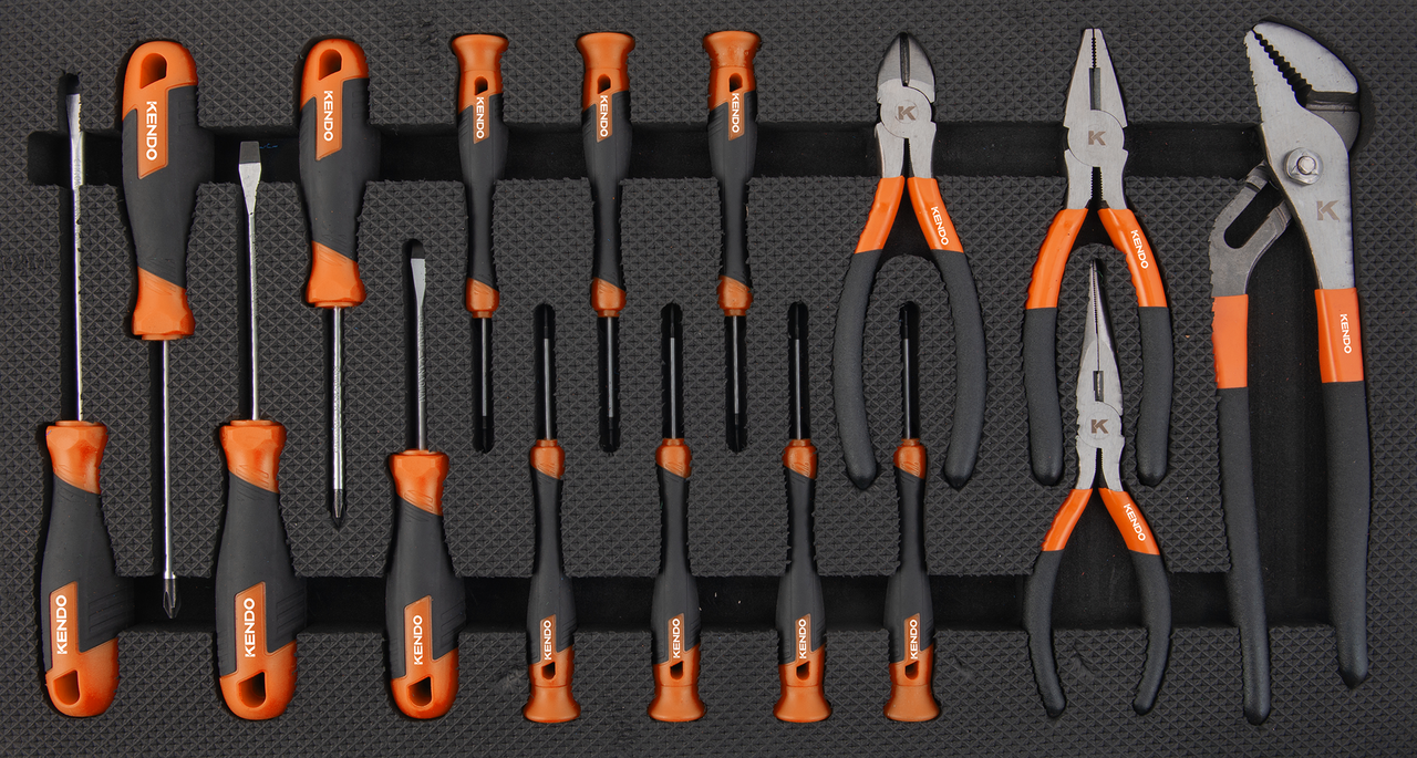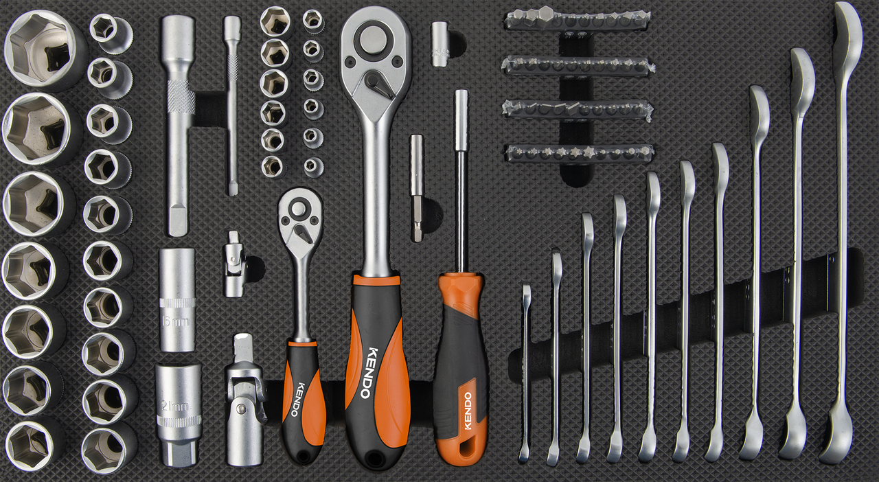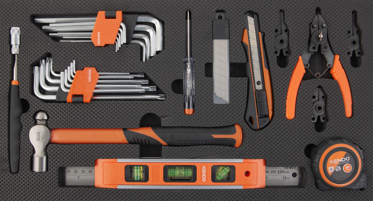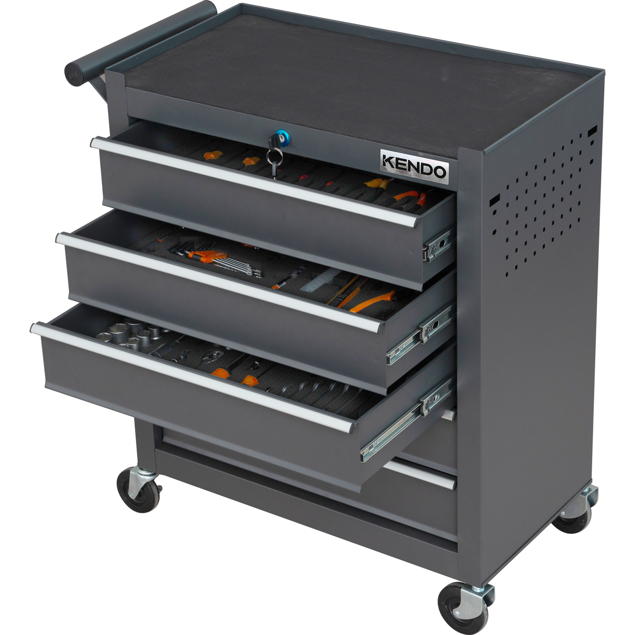Denne verktøyvognen fra Kendo inneholder en omfattende samling av verktøy for ulike oppgaver og prosjekter.