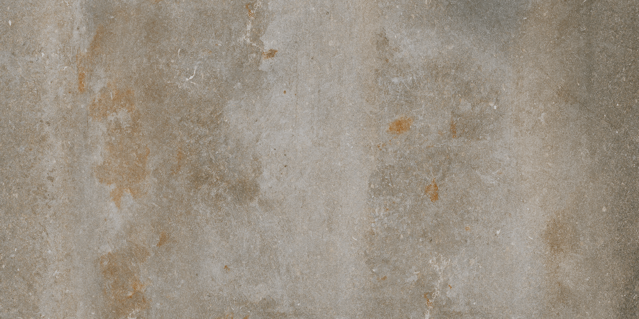 Rue de Paris Cobre i størrelse 45x90 cm fra Keraben representerer en kombinasjon av fargetoner. Flisen består av gråtoner, med innspill av mørkere områder i en behagelig miks i et mønster som kan minne om metallplater som er litt rustet.