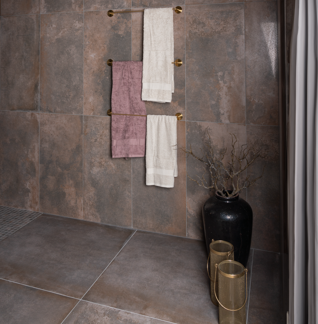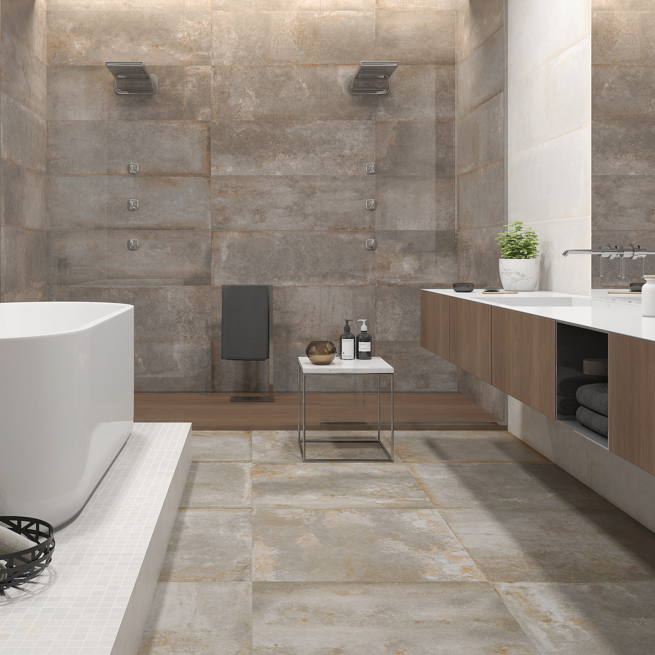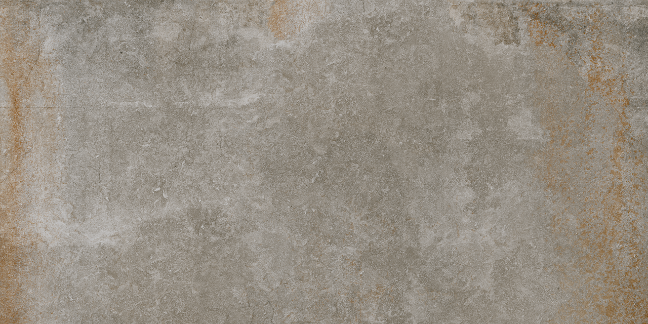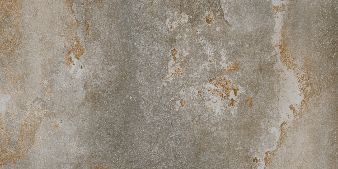 Rue de Paris Cobre i størrelse 45x90 cm fra Keraben representerer en kombinasjon av fargetoner. Flisen består av gråtoner med innspill av mørkere områder, i et mønster som kan minne om metallplater som er litt rustet.