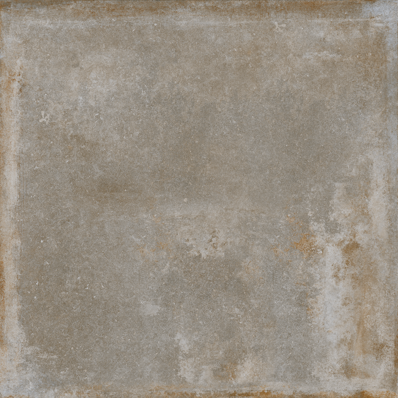 Rue de Paris Cobre i størrelse 90x90 cm fra Keraben representerer en kombinasjon av fargetoner. Flisen består av gråtoner med innspill av mørkere områder, i et mønster som kan minne om metallplater som er litt rustet.